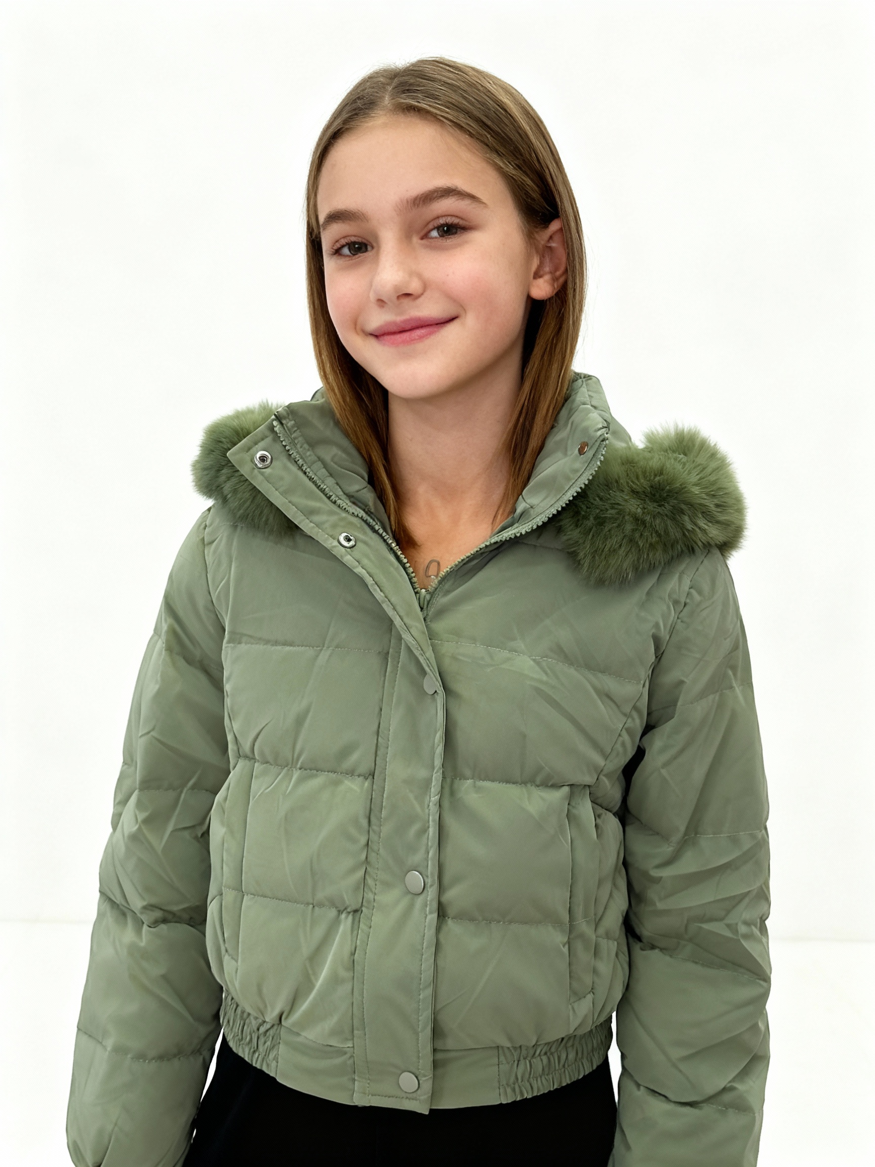 Зелёная утеплённая куртка с капюшоном и искусственным мехом