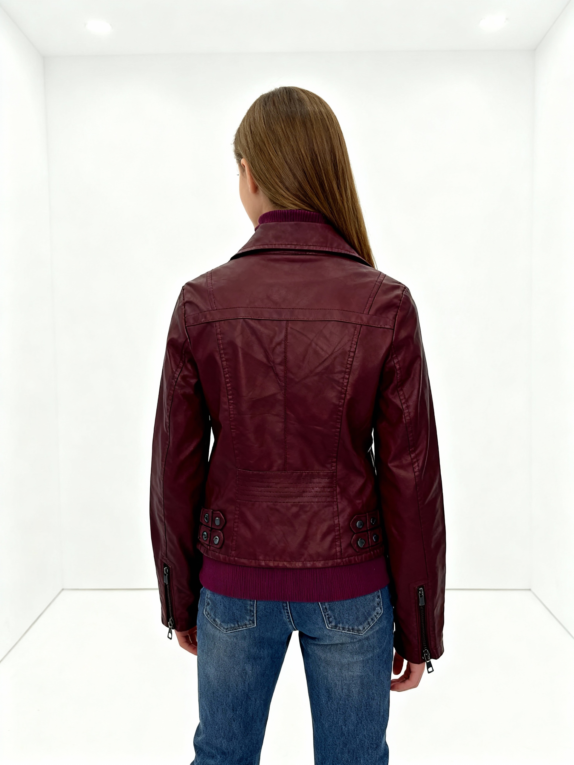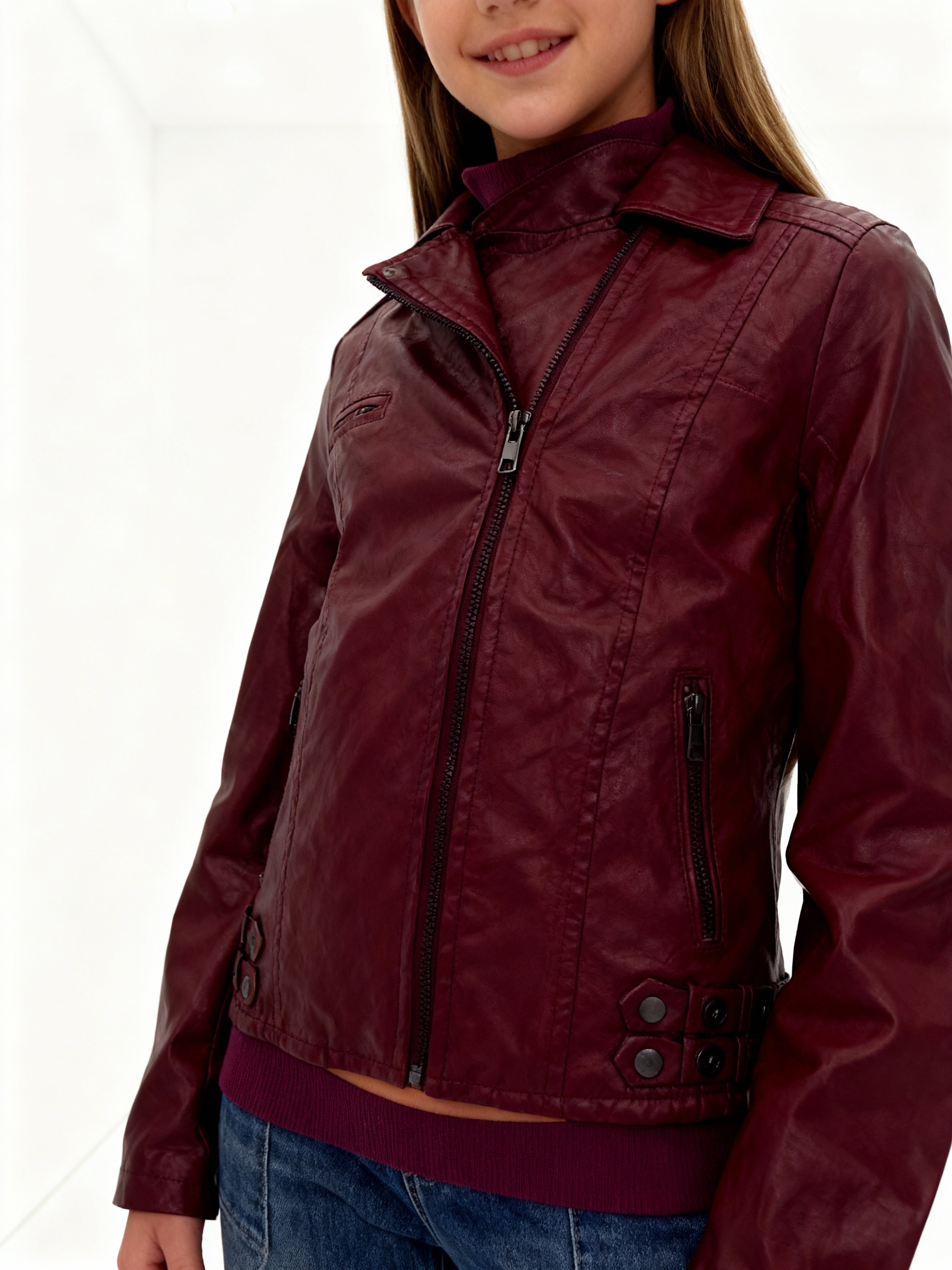 Стильная бордовая куртка из кожи с молниями и кнопками.
