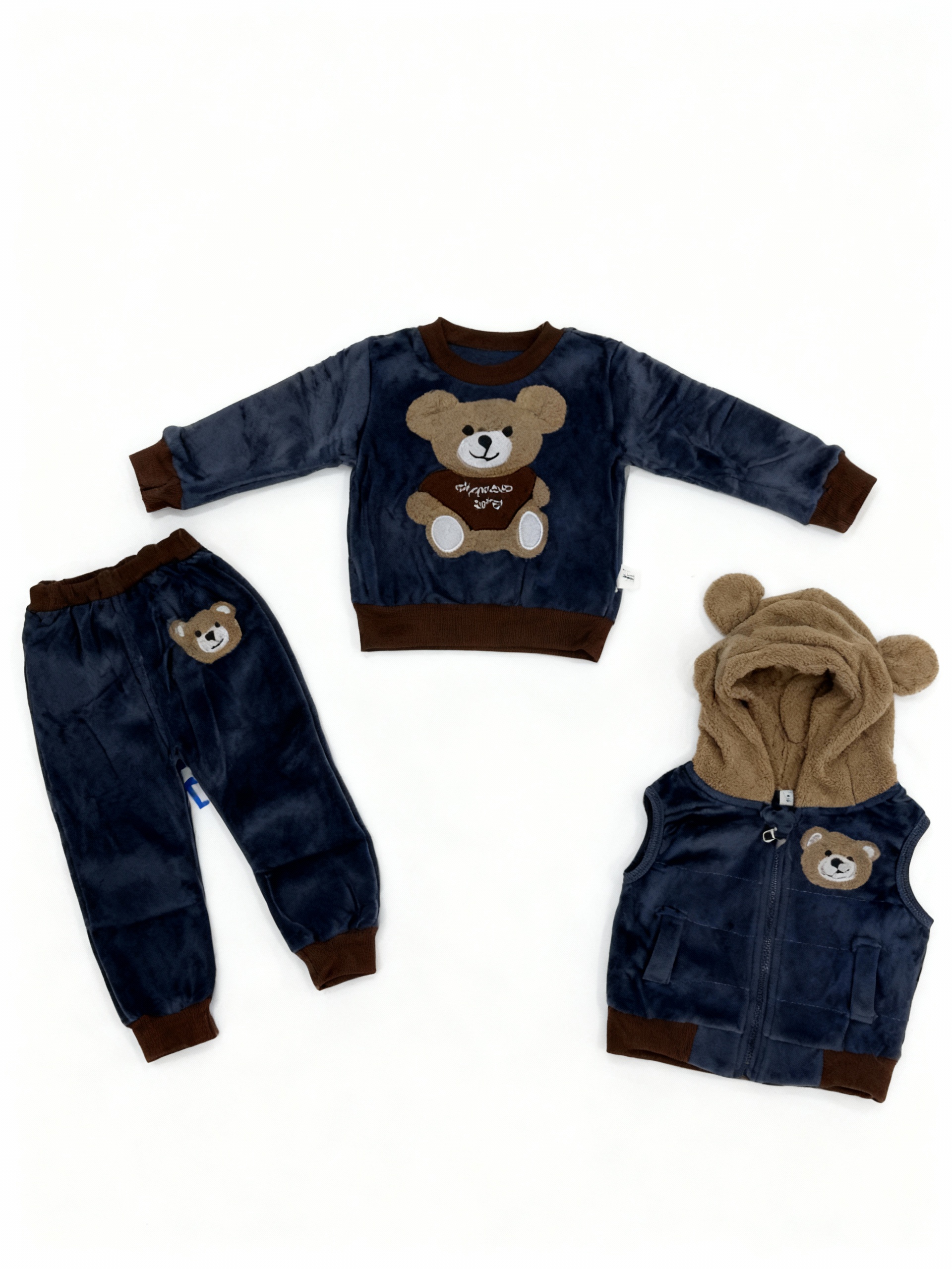 Детский костюм из велюра: свитшот, штаны, жилетка с мишкой