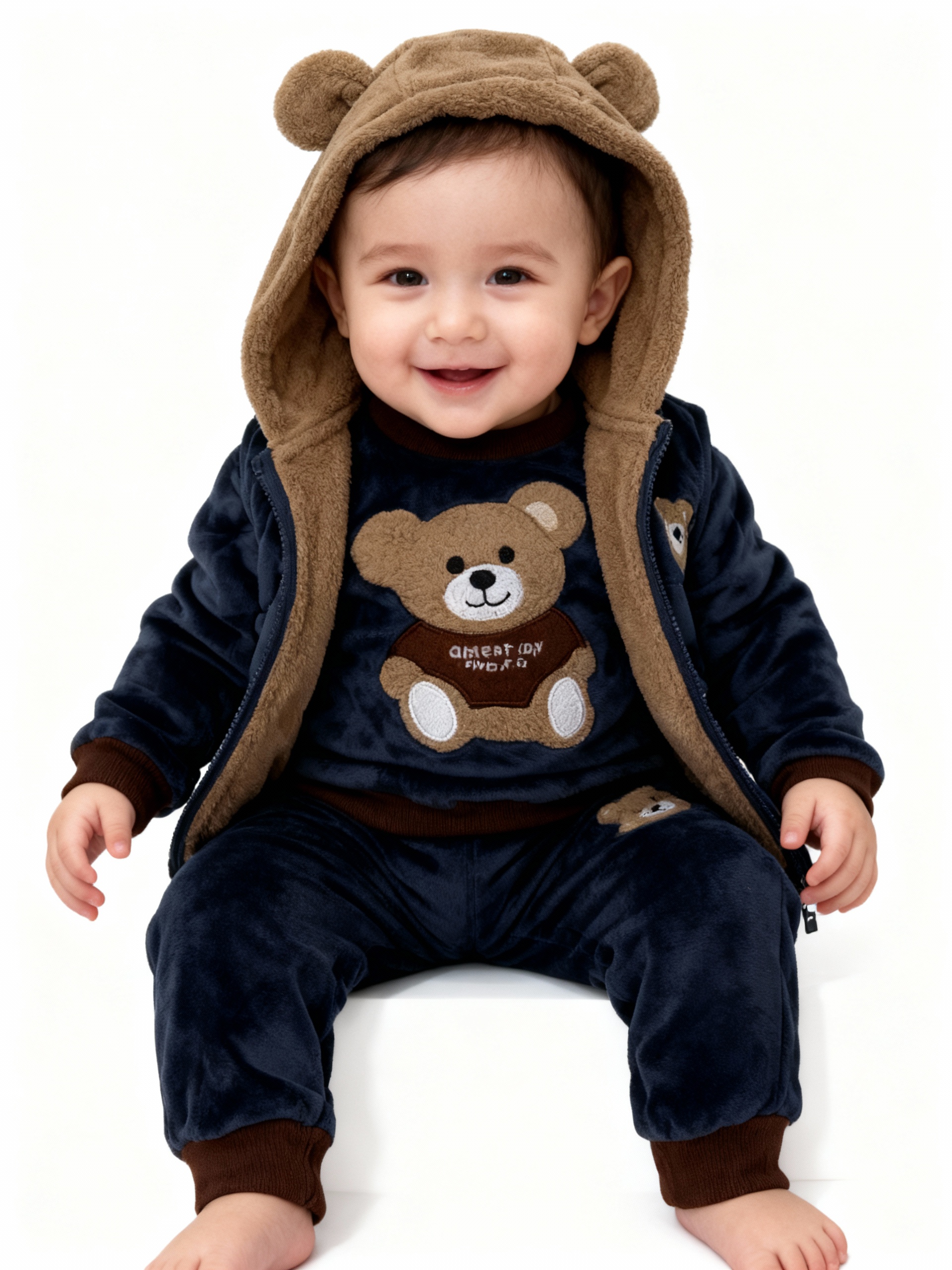 Детский костюм из велюра: свитшот, штаны, жилетка с мишкой