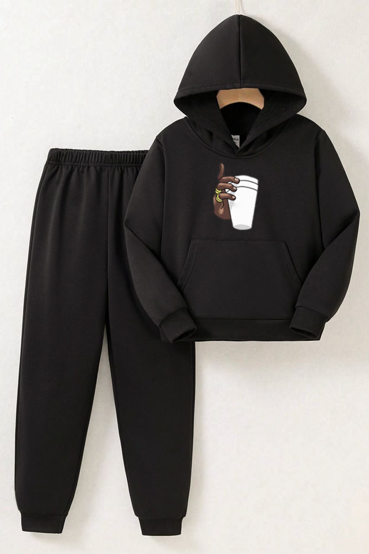Детский спортивный костюм из хлопка с капюшоном, состоящий из худи и брюк. Модель с длинными рукавами, регулируемой талией, двумя карманами и принтом. Подходит для повседневной носки.