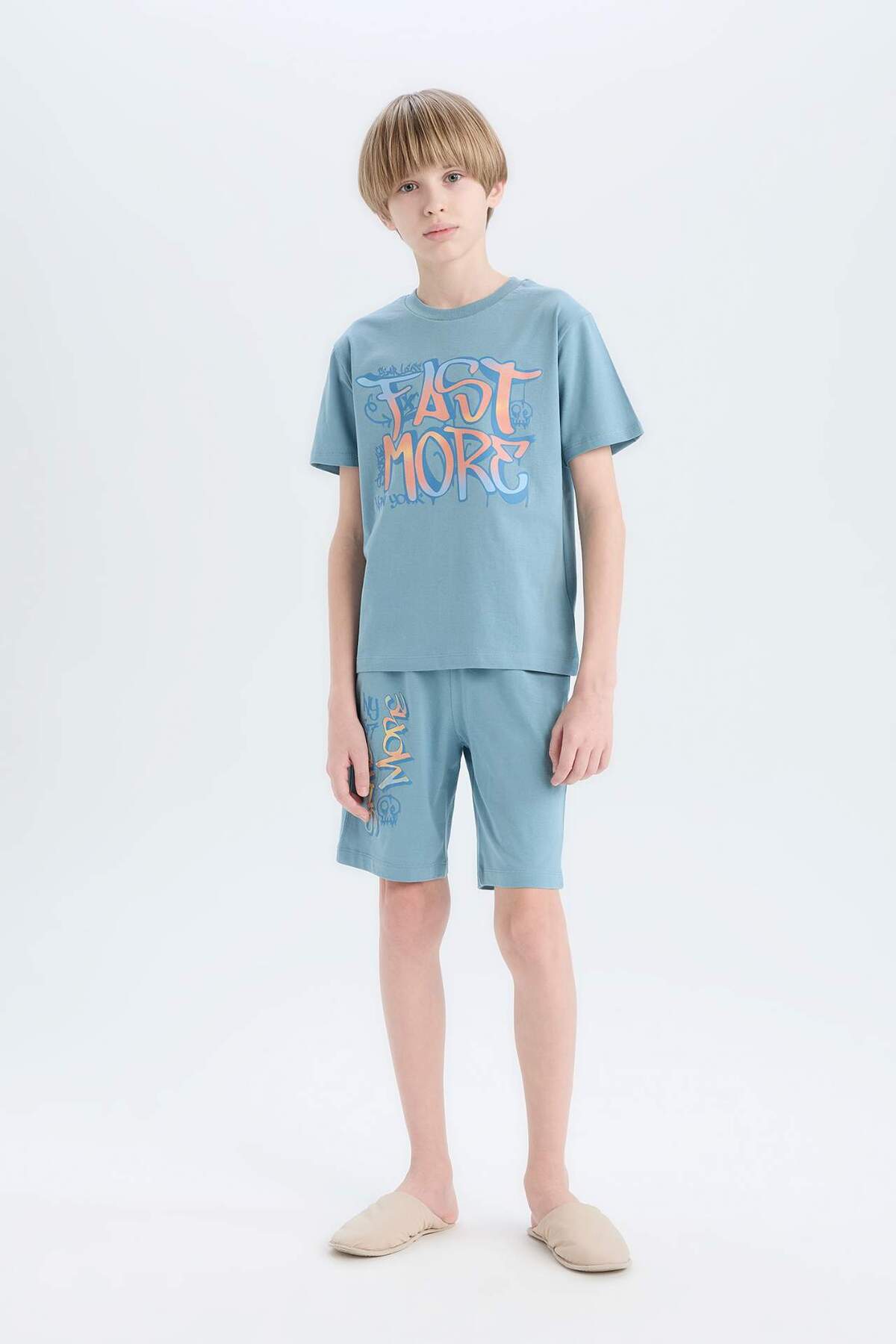 Бренд - DeFacto; Высота талии - Нормальная; Длина - Короткий; Длина рукава - Короткий рукав; Материал (состав) - Хлопок; Модель - Стандарт; Страна производства - Турция; Тип воротника - U-вырез; Ткань - Трикотаж; Узор - С принтом; Цвет - Синий; Штанина - Узкая