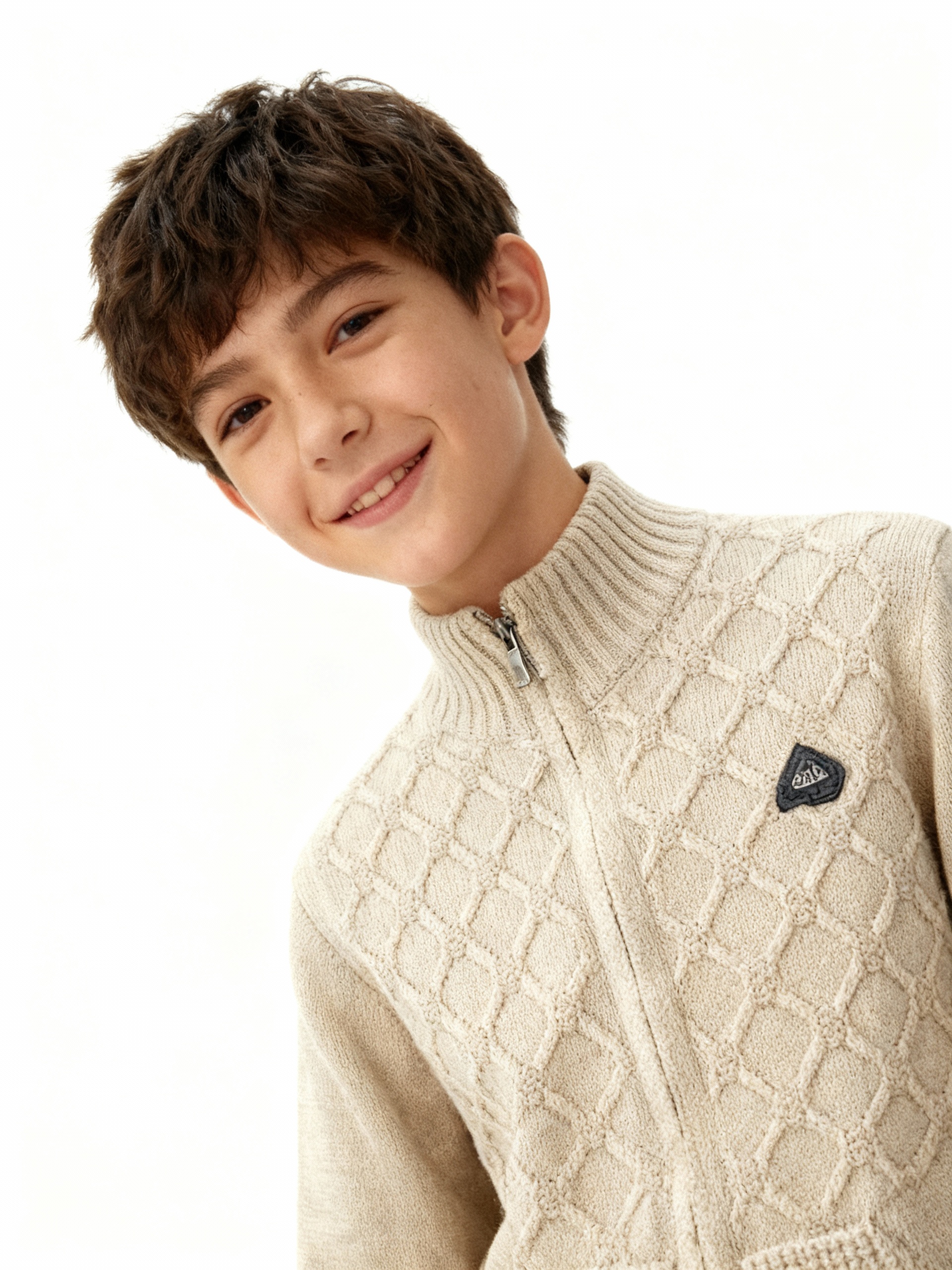 Бежевый вязаный кардиган на молнии, текстурный узор и маленький логотип
