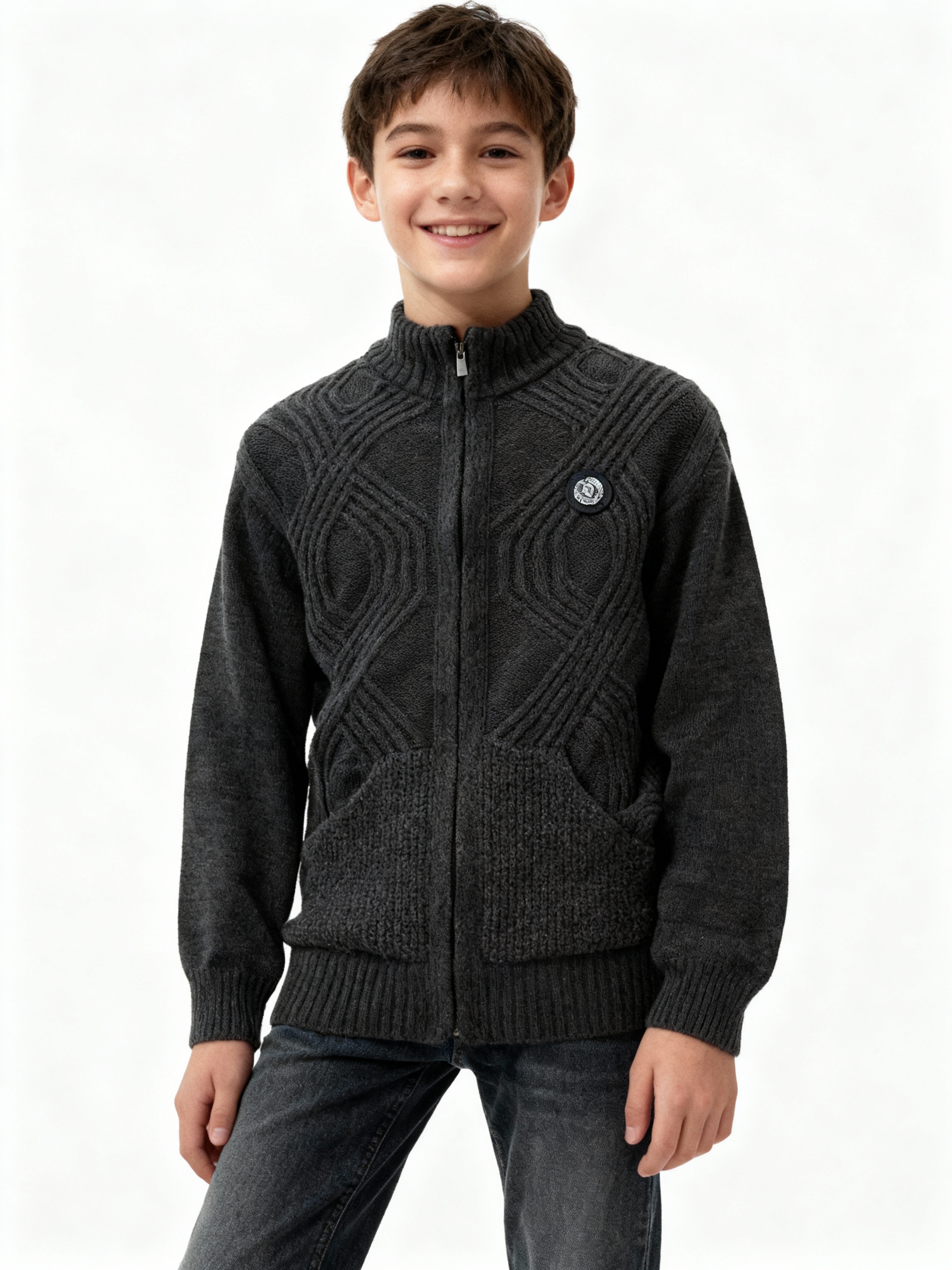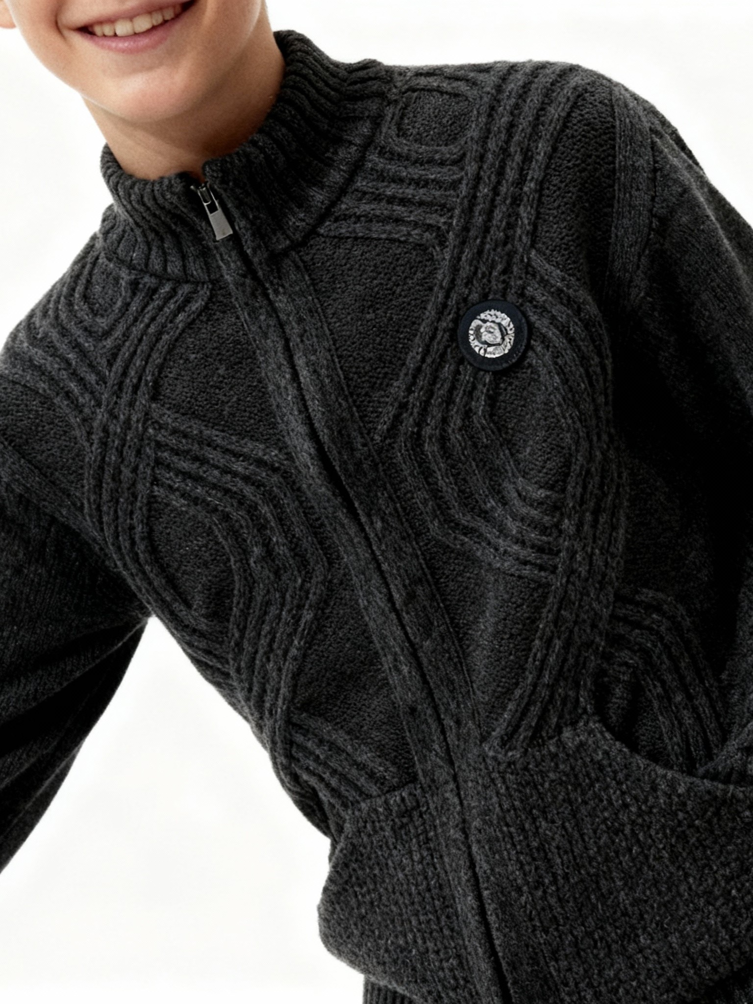 Тёмно-серый вязаный кардиган на молнии с узором и небольшим логотипом