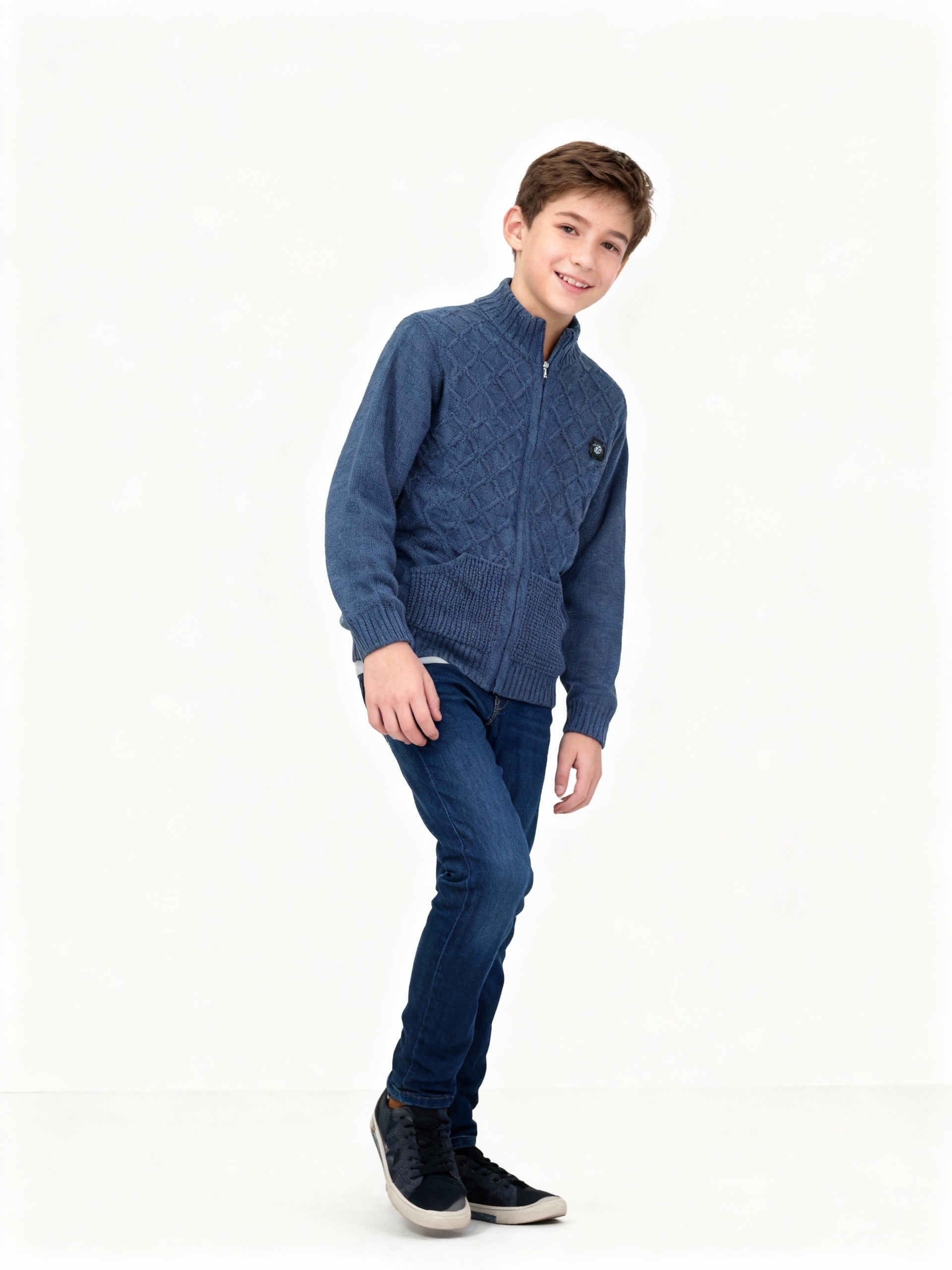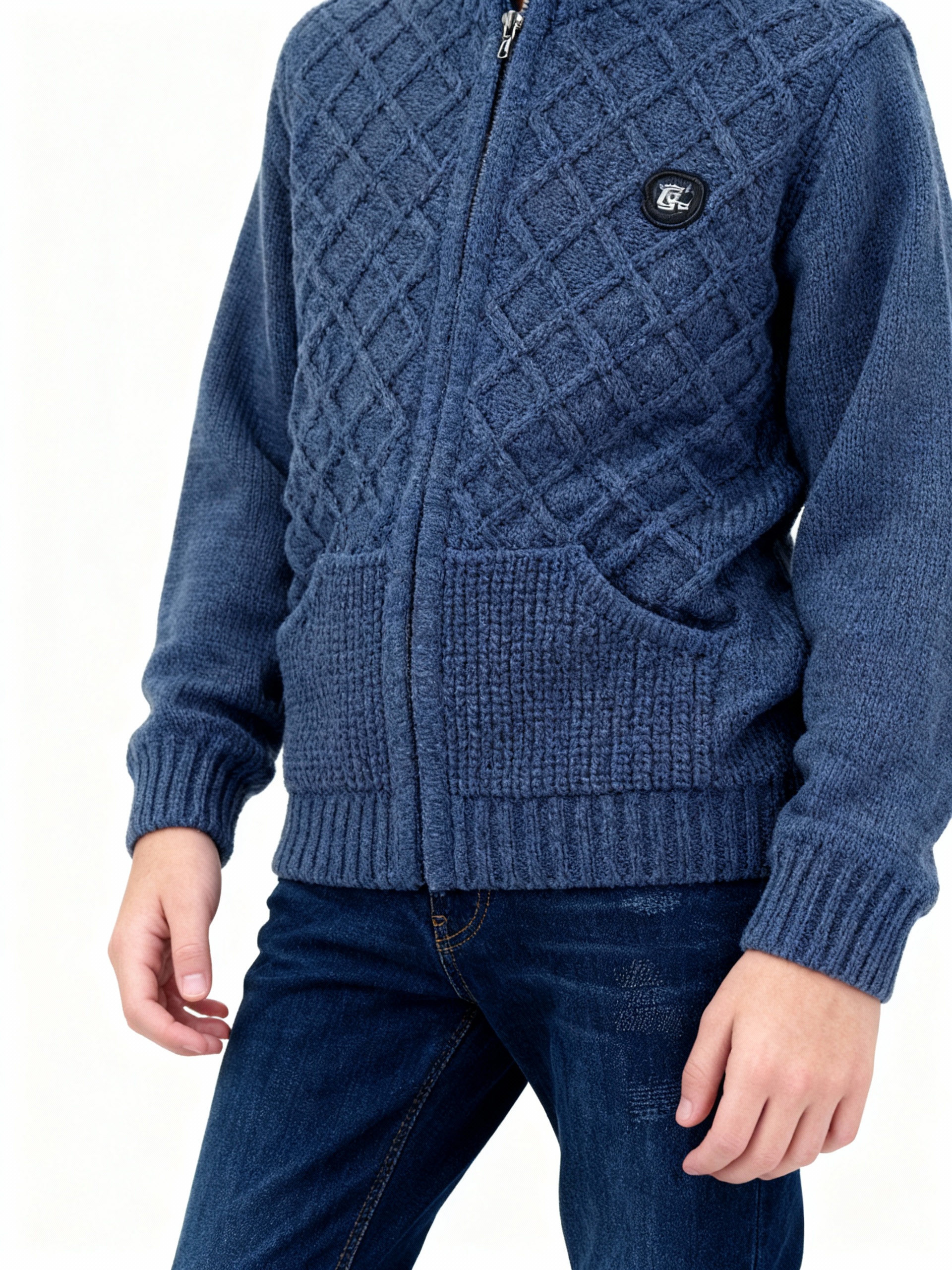 Синий вязаный кардиган на молнии, текстурный узор и маленький логотип