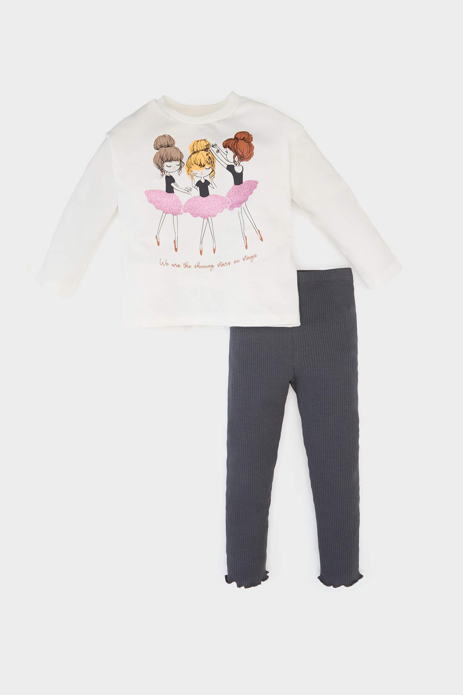 Комплект для девочки 2 предмета: футболка с длинными рукавами с принтом балерины и лосины с резинкой на талии DeFacto