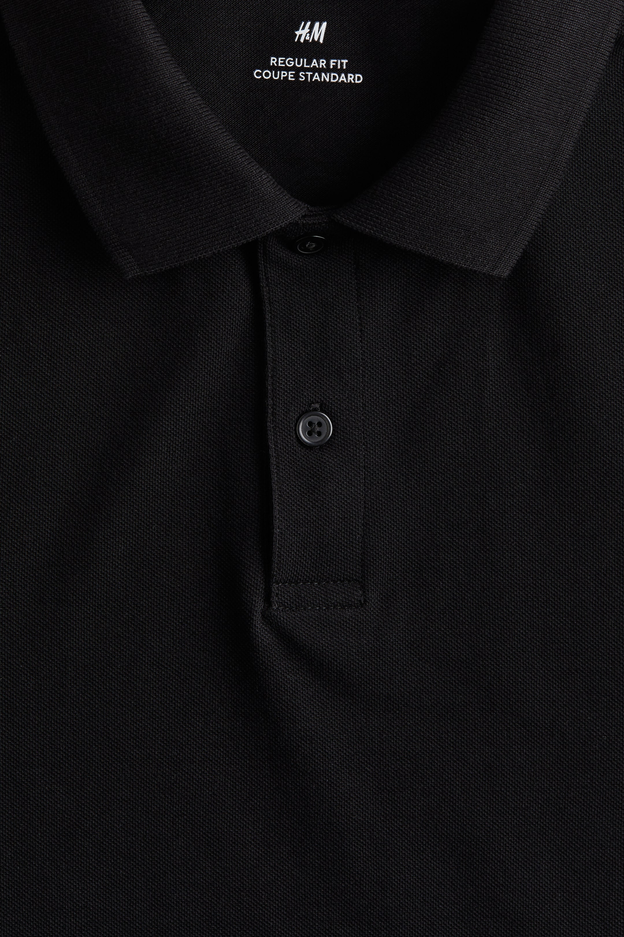 Бренд - H&M; Длина - Стандарт; Длина рукава - Короткий рукав; Материал (состав) - Хлопок; Модель - Стандарт; Тип воротника - Polo; Ткань - Пике; Узор - Однотонный; Цвет - Черный