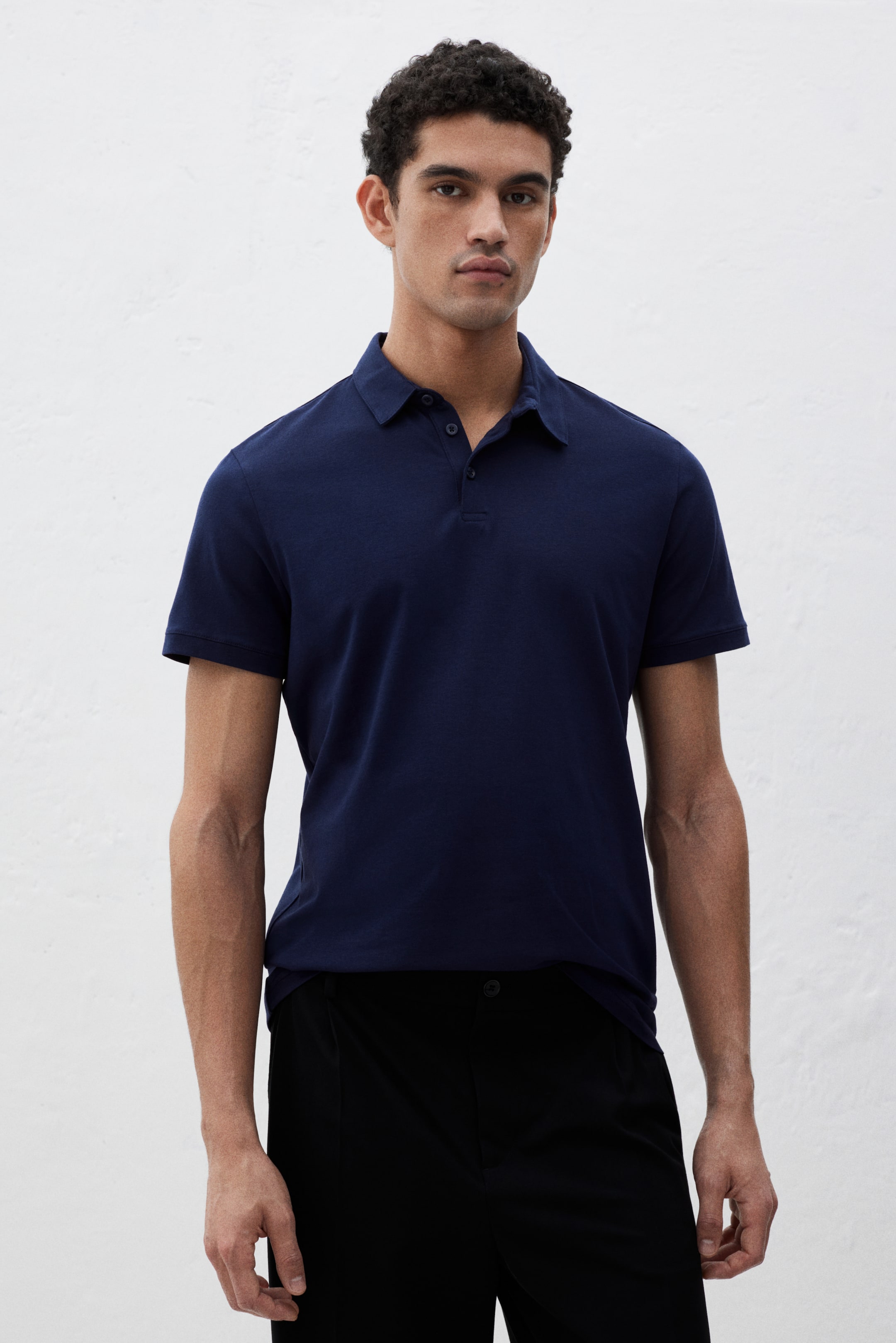 Хлопковая легкая футболка поло с воротником, застежкой на пуговицы, короткими рукавами и прямым подолом. Облегающий крой подчеркивает контуры тела.