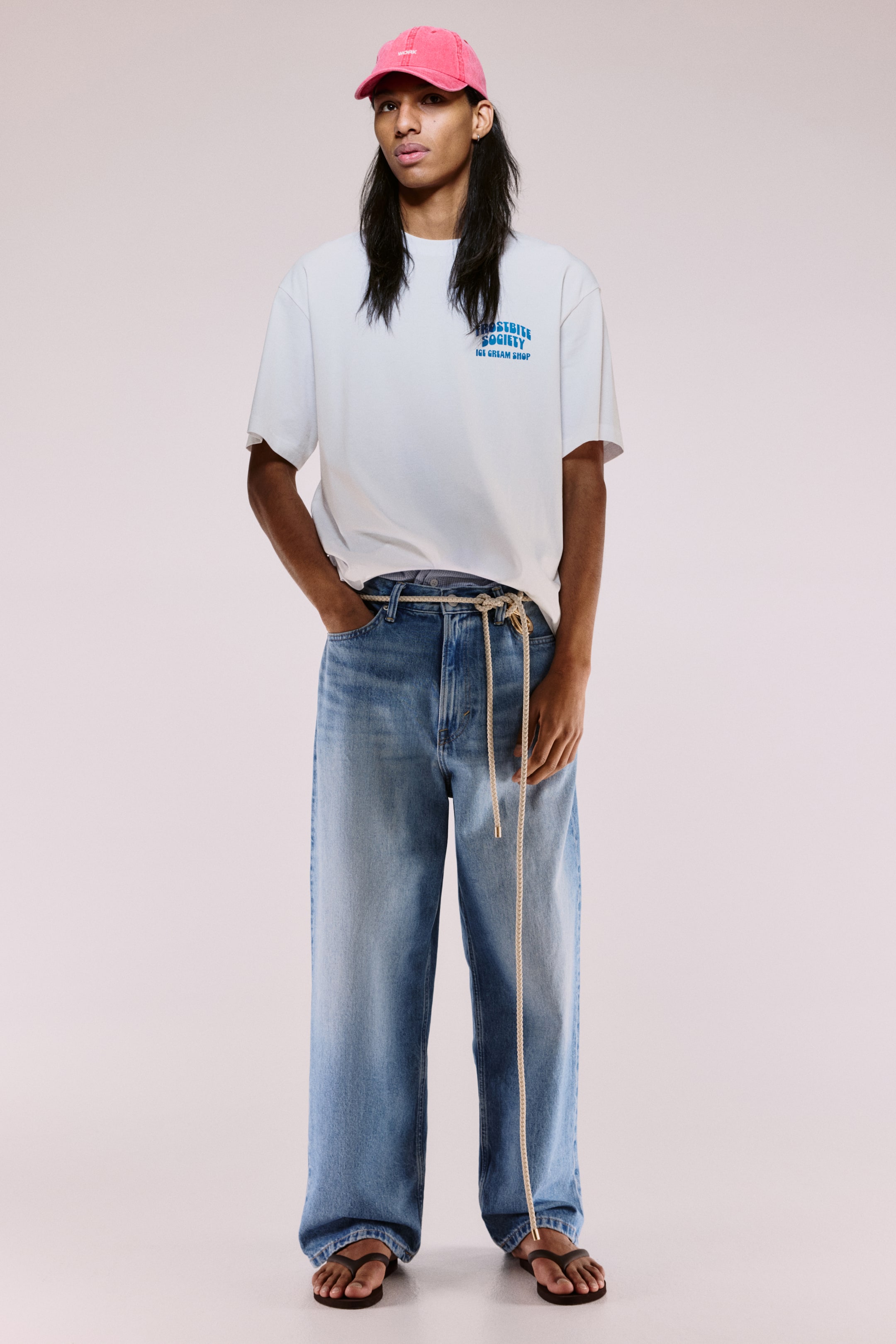 Хлопковая футболка средней толщины с принтом, круглым вырезом, рибаной отделкой, низкими плечами и прямым подолом. Свободный крой создает широкий, но не оверсайз силуэт.