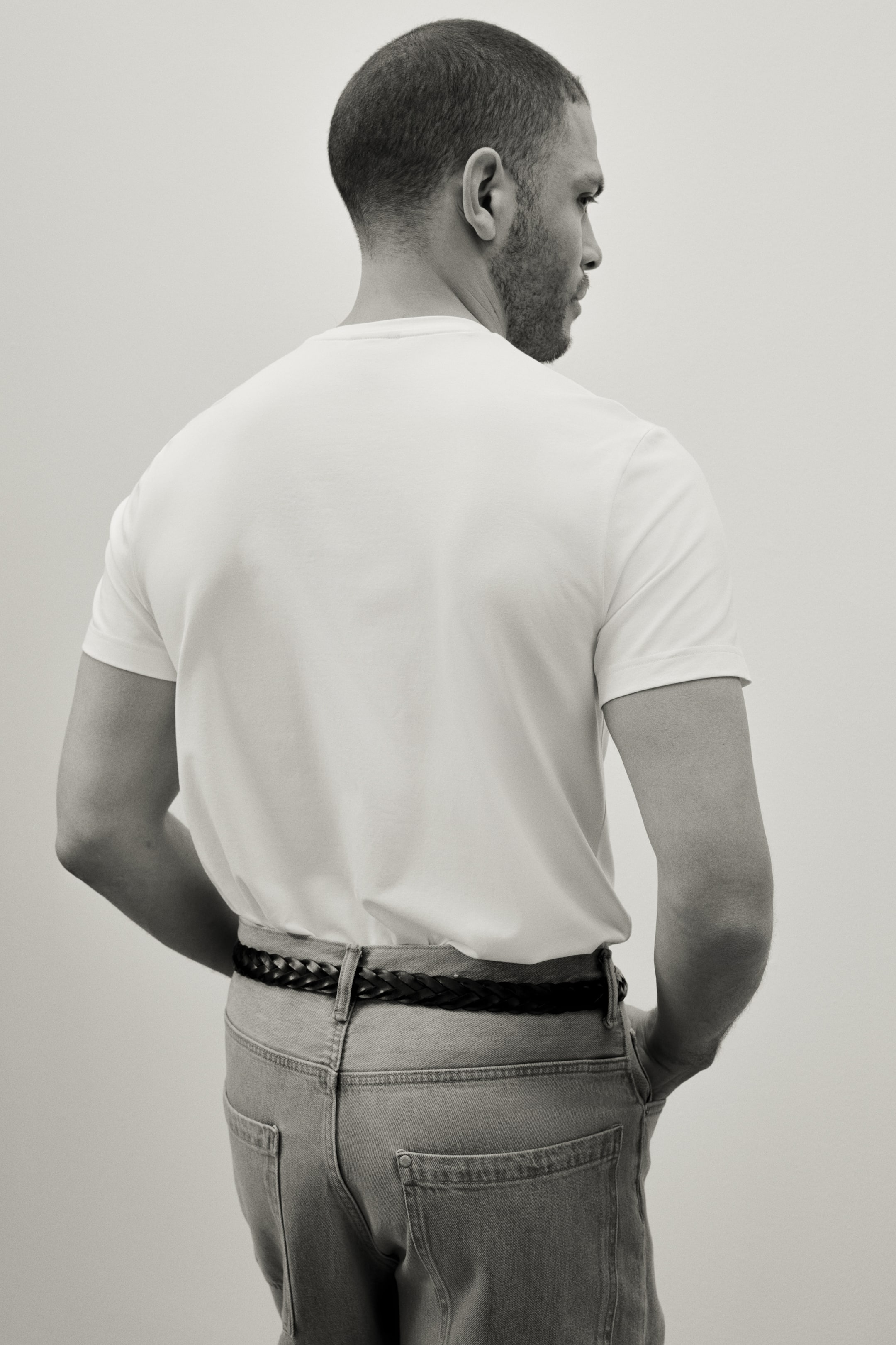 Хлопковая легкая футболка с V-образным вырезом и прямым подолом. Облегающий силуэт подчеркивает контуры тела.