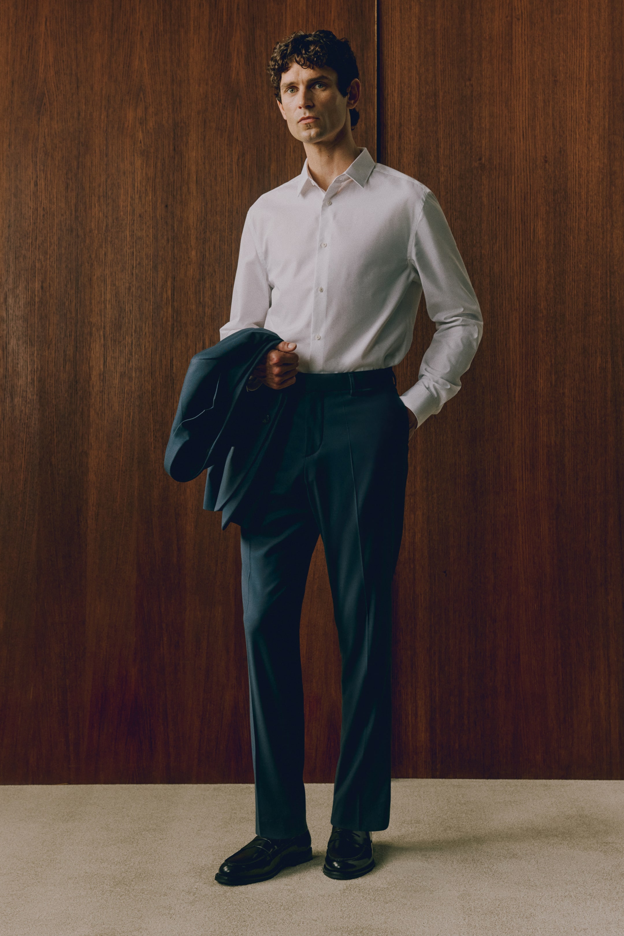 Рубашка из легко гладящейся тканной ткани с отделкой. Отложной воротник, классическая планка спереди, со складками сзади. Длинные рукава с регулируемыми манжетами на пуговицах, манжеты с застежкой на пуговицы. Низ слегка закругленный. Узкий крой подчеркивает контуры тела и обеспечивает идеальную посадку.