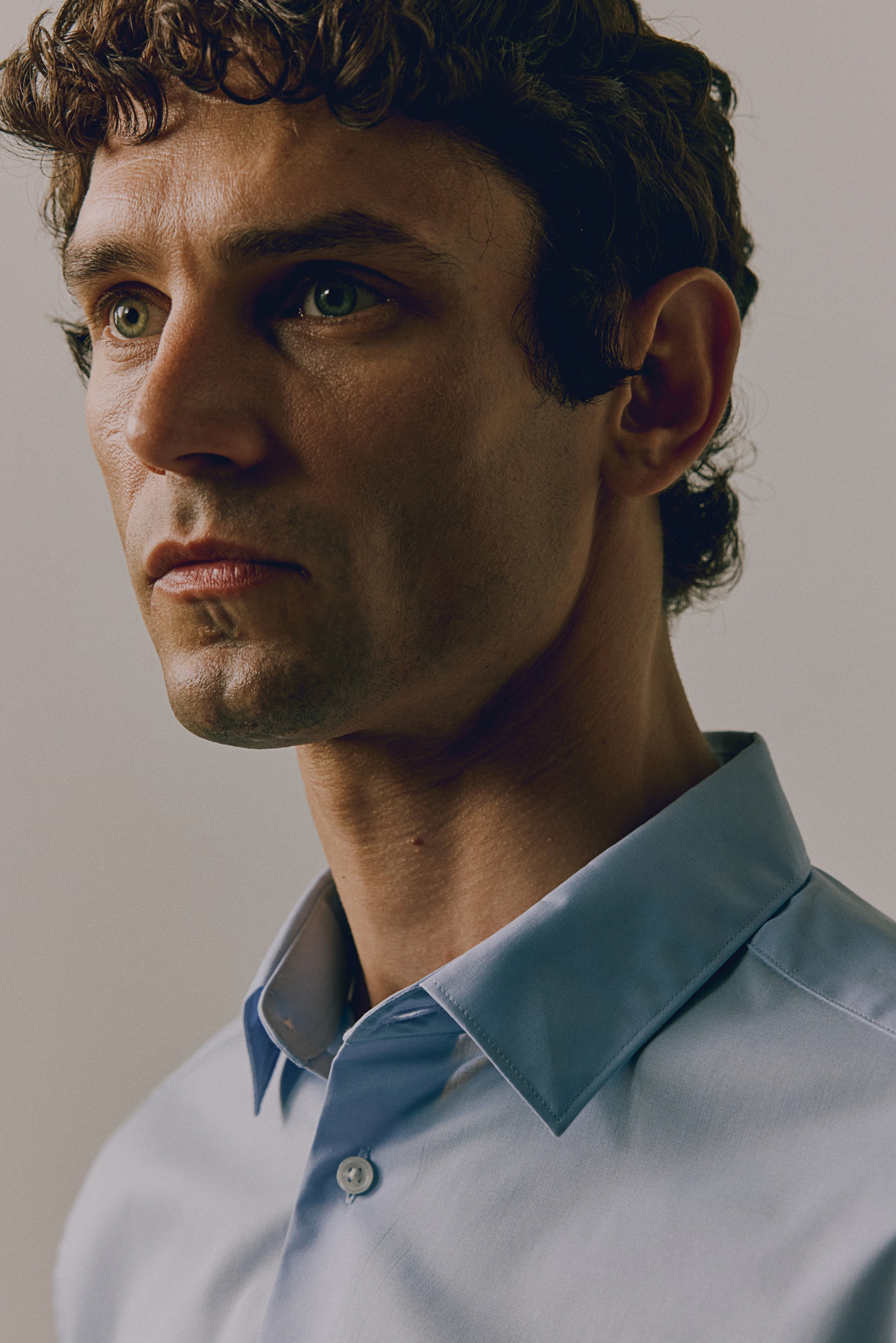 Бренд - H&M; Длина - Стандарт; Длина рукава - Длинный рукав; Материал (состав) - Полиэстер, Хлопок; Модель - Узкий; Тип воротника - Воротник рубашки; Узор - Однотонный; Цвет - Голубой