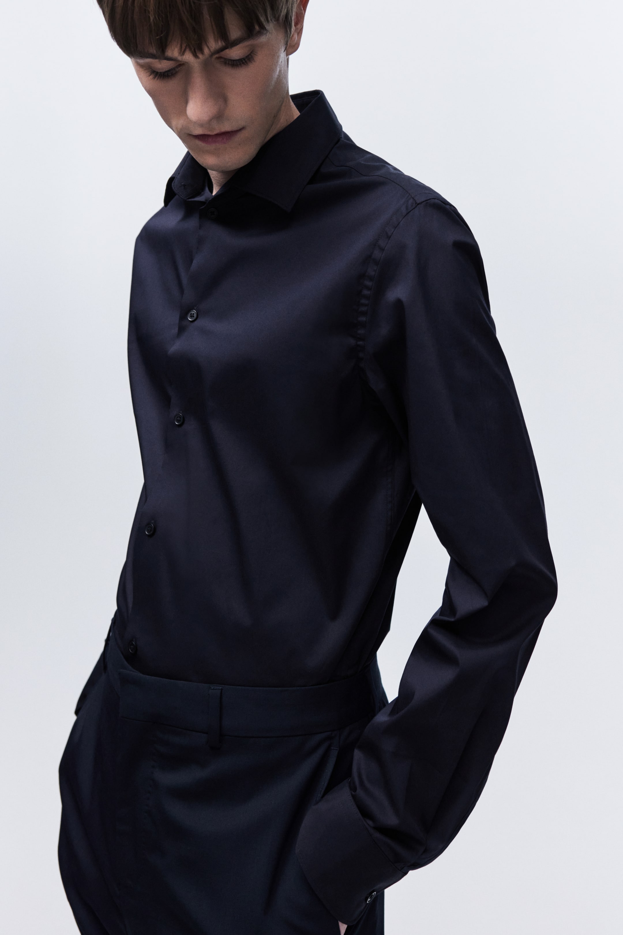 Бренд - H&M; Длина - Стандарт; Длина рукава - Длинный рукав; Модель - Узкий; Тип воротника - Воротник рубашки; Узор - Однотонный; Цвет - Черный