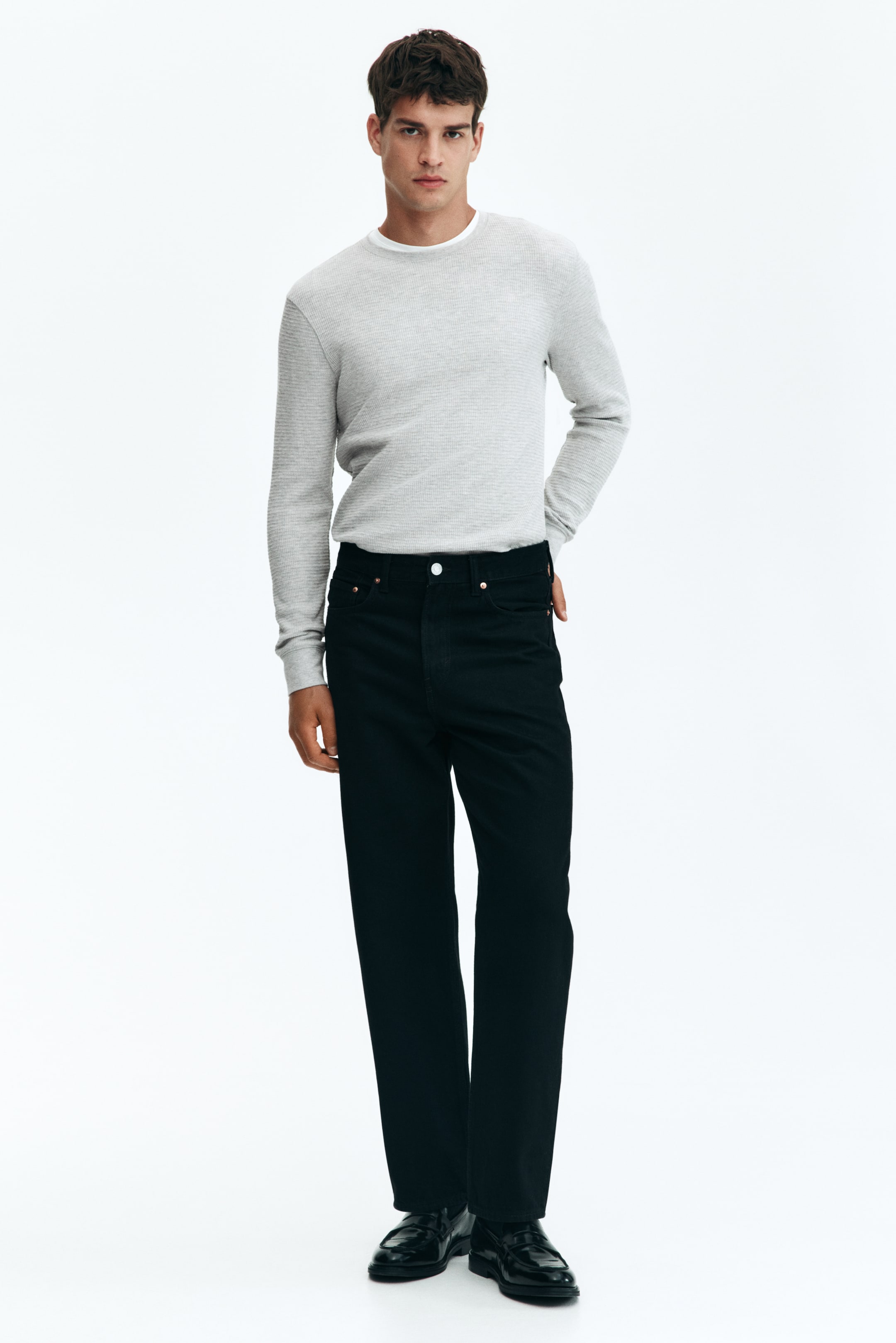 Мужской верх из хлопковой смесовой ткани с сотовой текстурой, средней толщины, с круглым воротником, длинными рукавами и прямым подолом. Облегающий силуэт подчеркивает контуры тела.