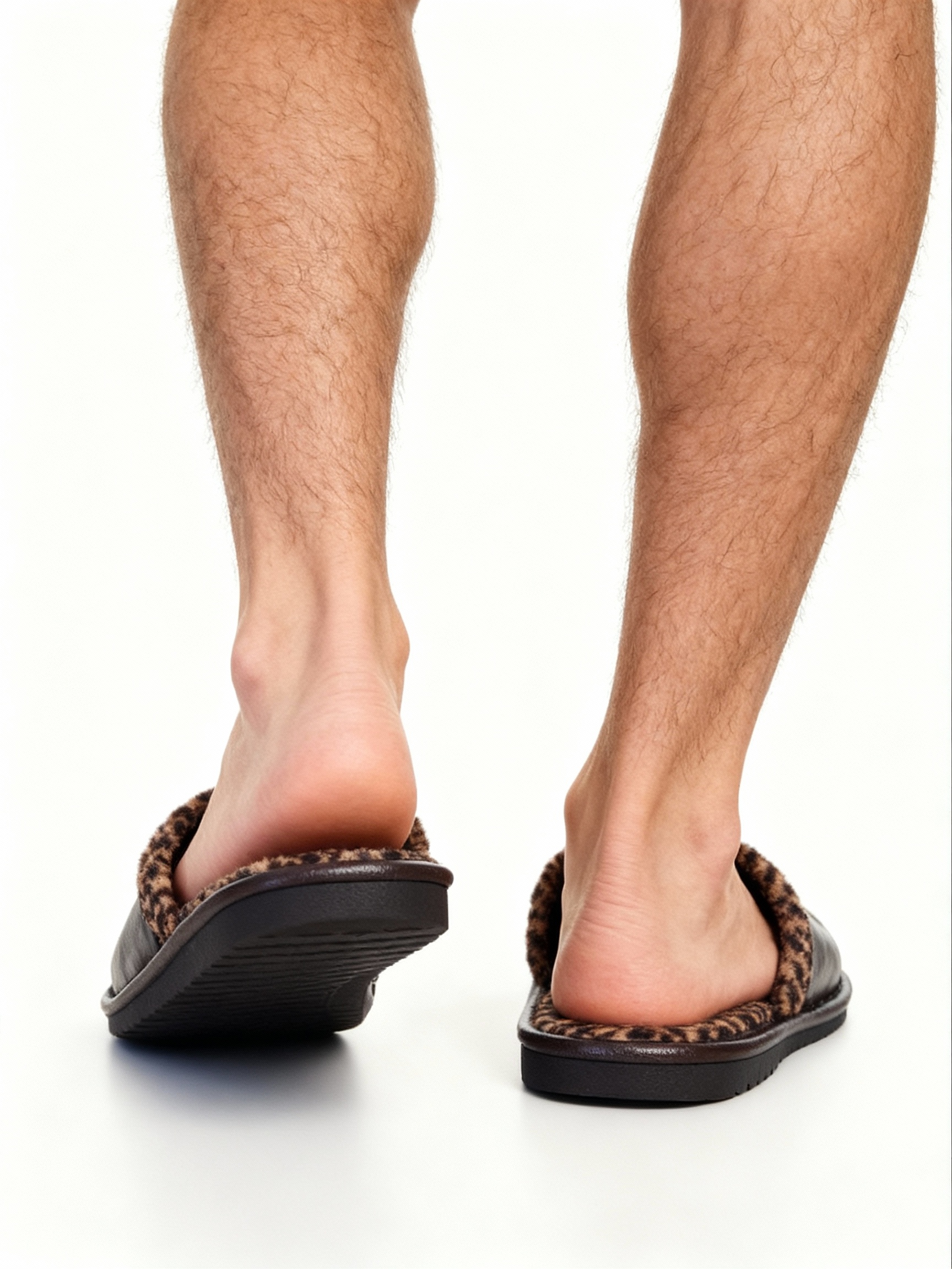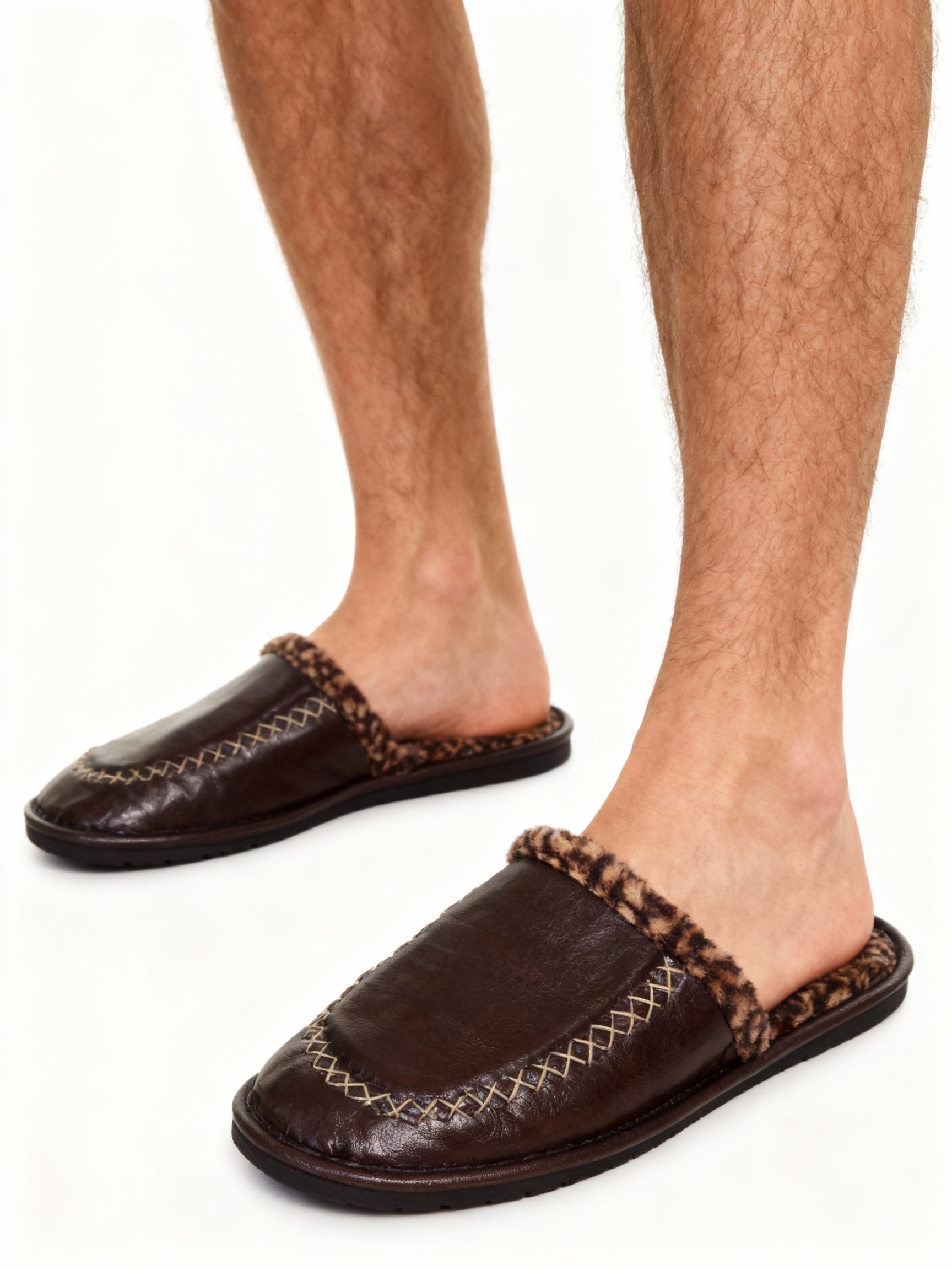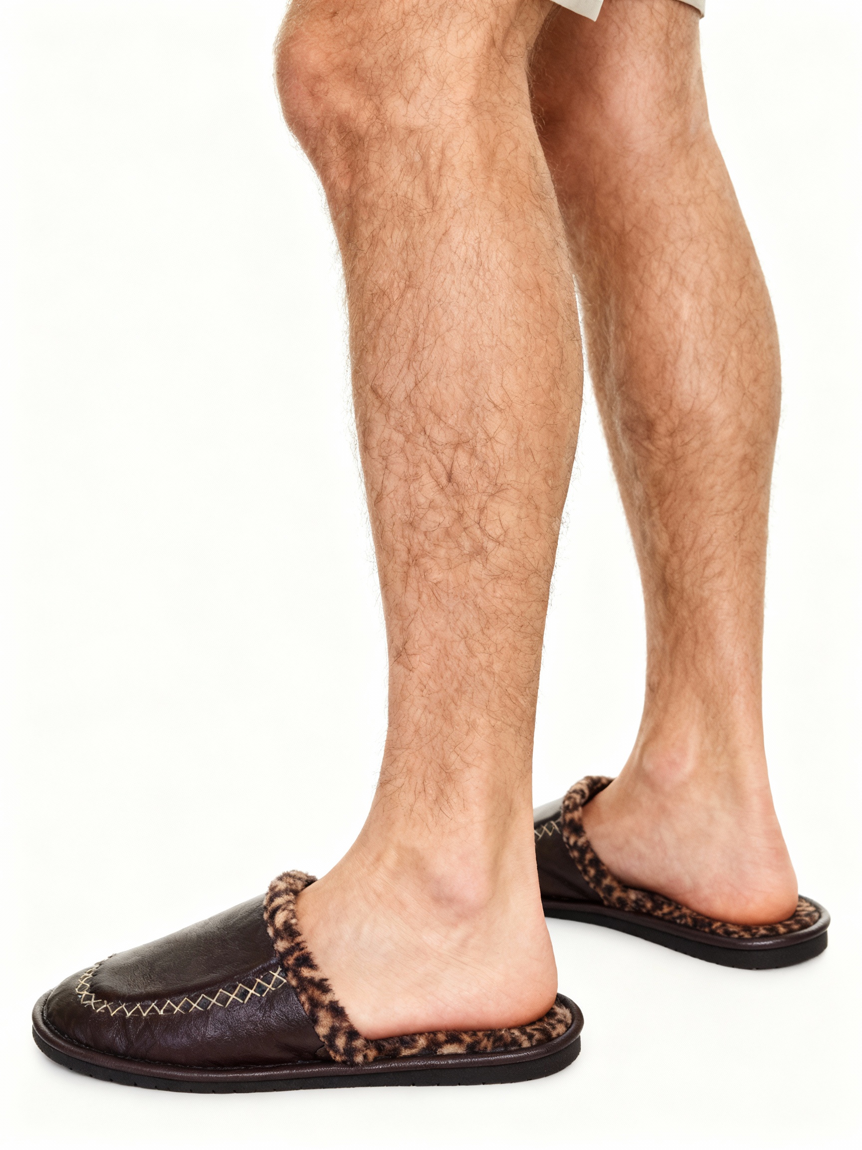 Комнатные тапочки из коричневой кожи с внутренней с леопардовым принтом.
