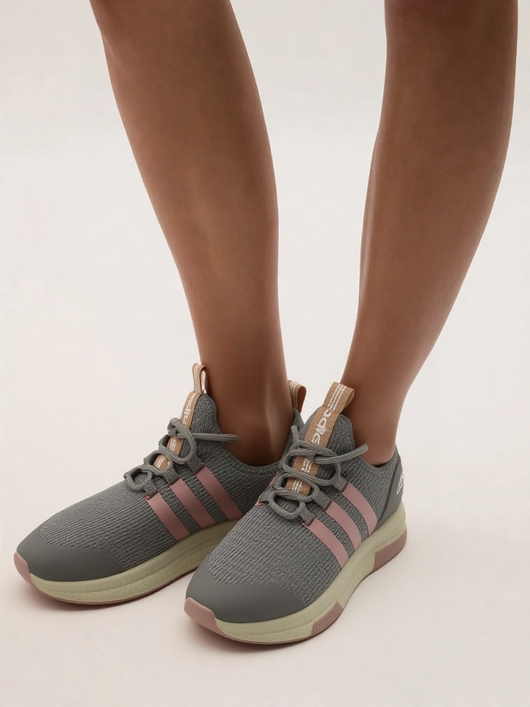 Спортивные серые кроссовки с розовыми полосками, сетчатый верх.