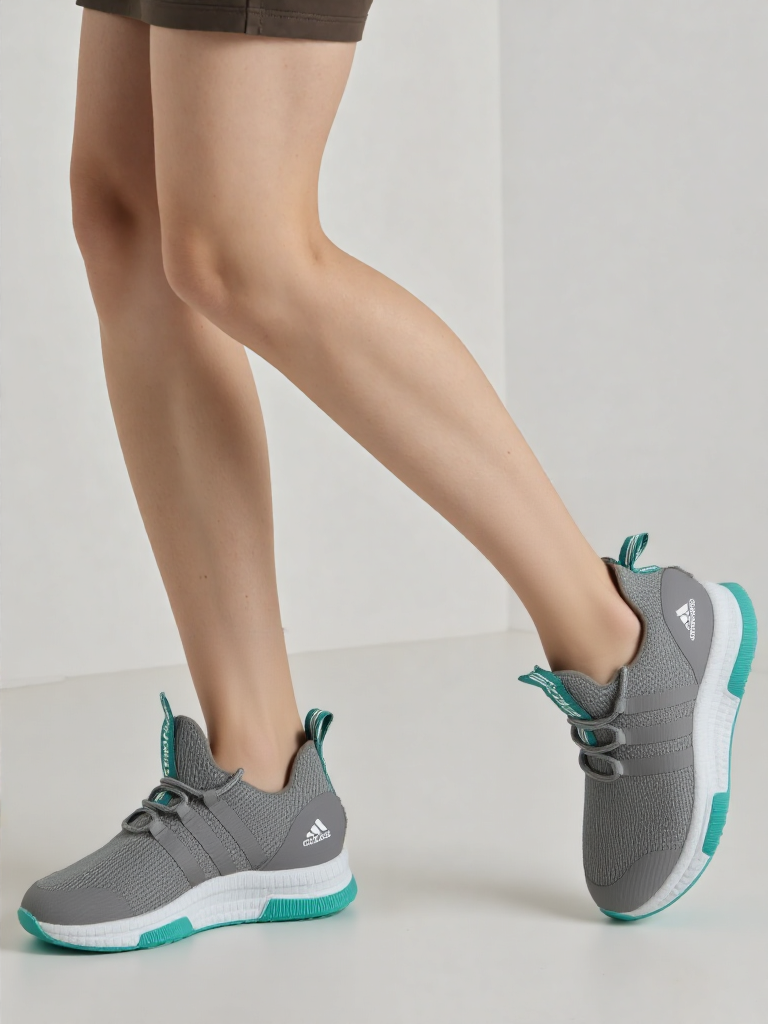 Серые кроссовки с бирюзовыми акцентами, лёгкие, удобные, стильные.