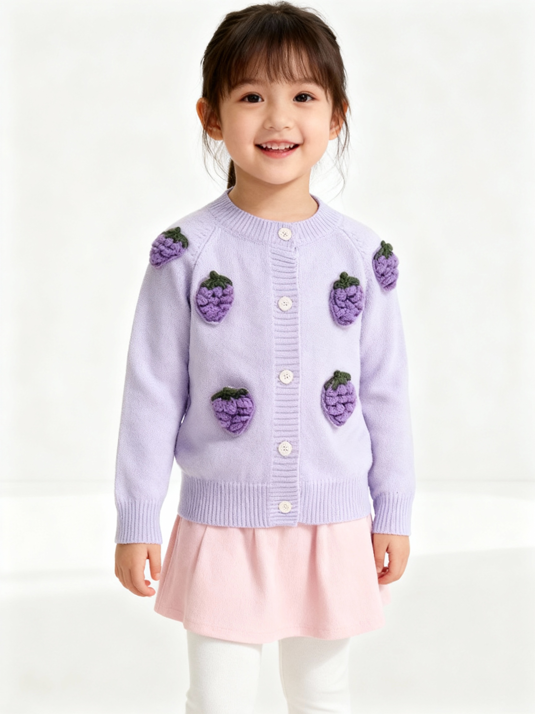 Милый детский кардиган нежно-лавандового цвета, украшенный объёмными вязанными ягодками, добавляющими очарования и игривости образу.