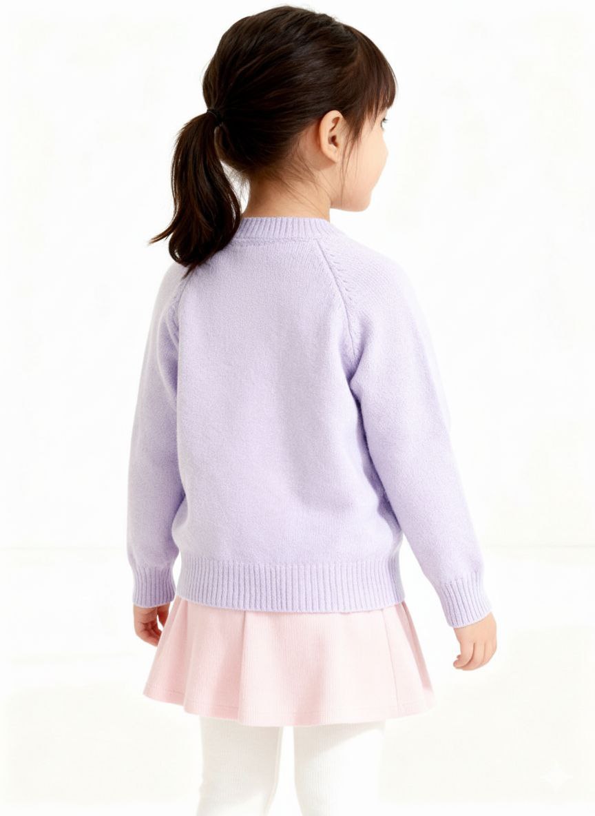 Милый детский кардиган нежно-лавандового цвета, украшенный объёмными вязанными ягодками, добавляющими очарования и игривости образу.