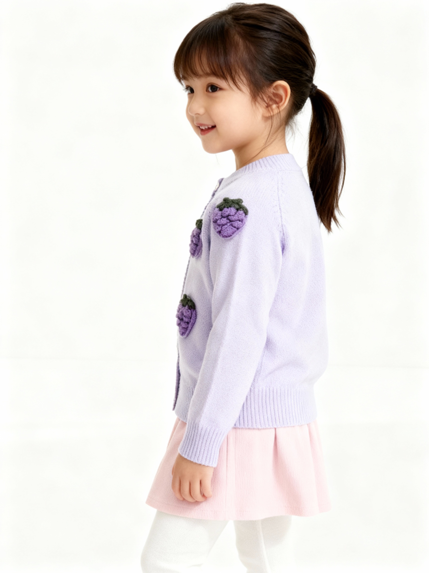 Милый детский кардиган нежно-лавандового цвета, украшенный объёмными вязанными ягодками, добавляющими очарования и игривости образу.