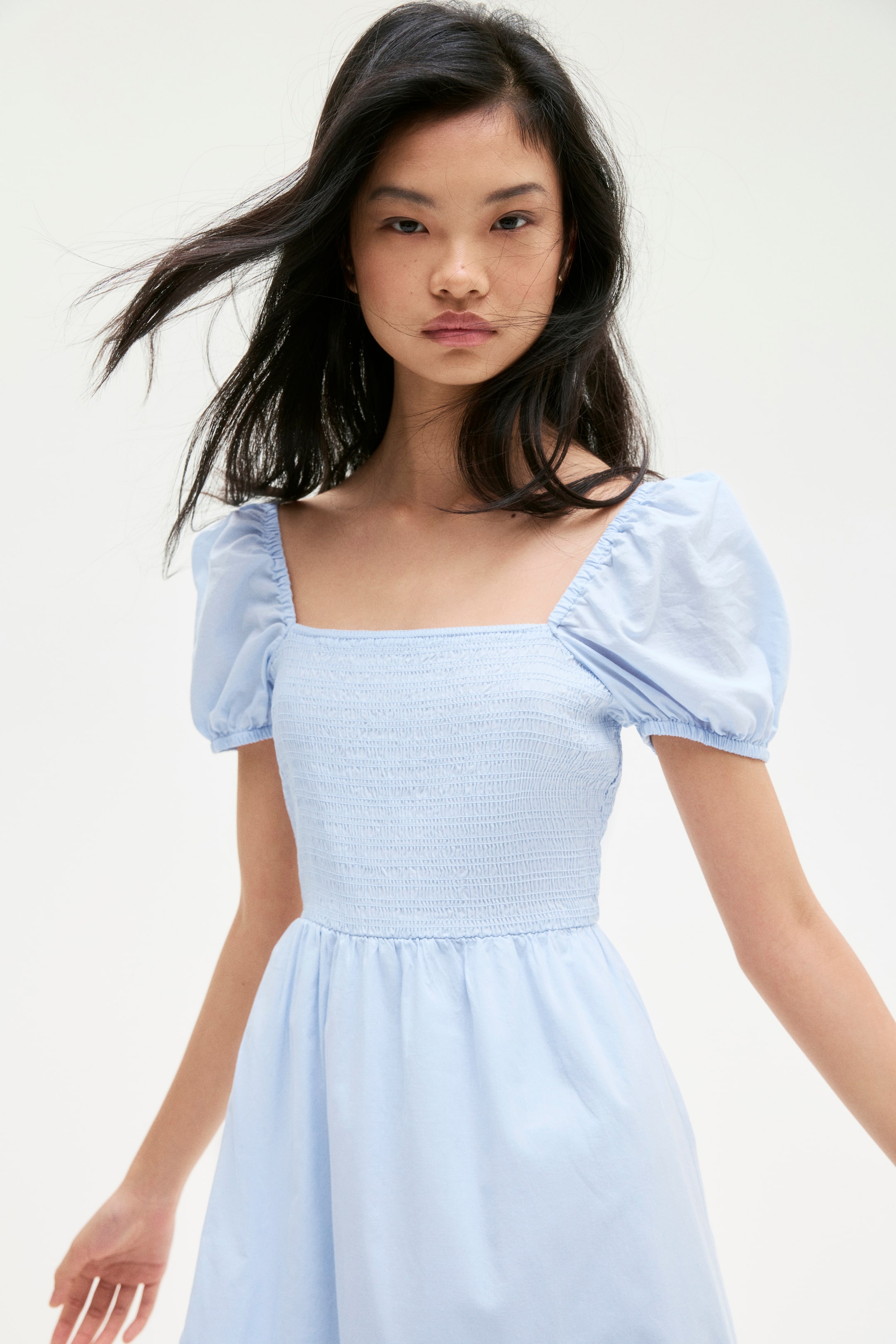 Длинное платье из тонкой хлопковой ткани с квадратным воротником на резинке и короткими пышными рукавами. Плечи и манжеты рукавов с тонкой резинкой. Облегающий лиф с защипами и слегка расклешенной юбкой. Частично на подкладке.