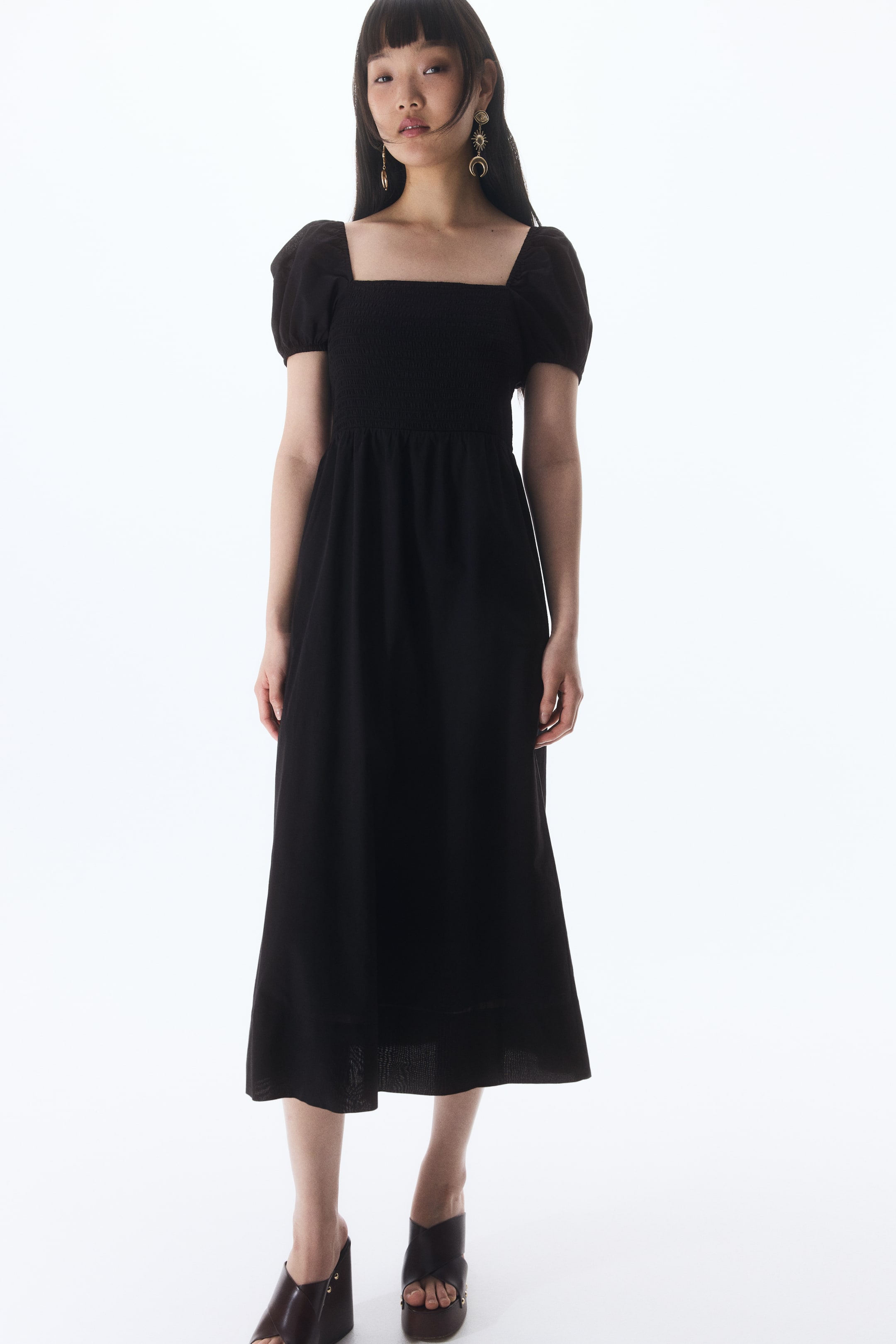 Длинное платье из тонкой хлопковой ткани с квадратным воротником на резинке и короткими пышными рукавами. Плечи и манжеты рукавов с тонкой резинкой. Облегающий лиф с защипами и слегка расклешенной юбкой. Частично на подкладке.