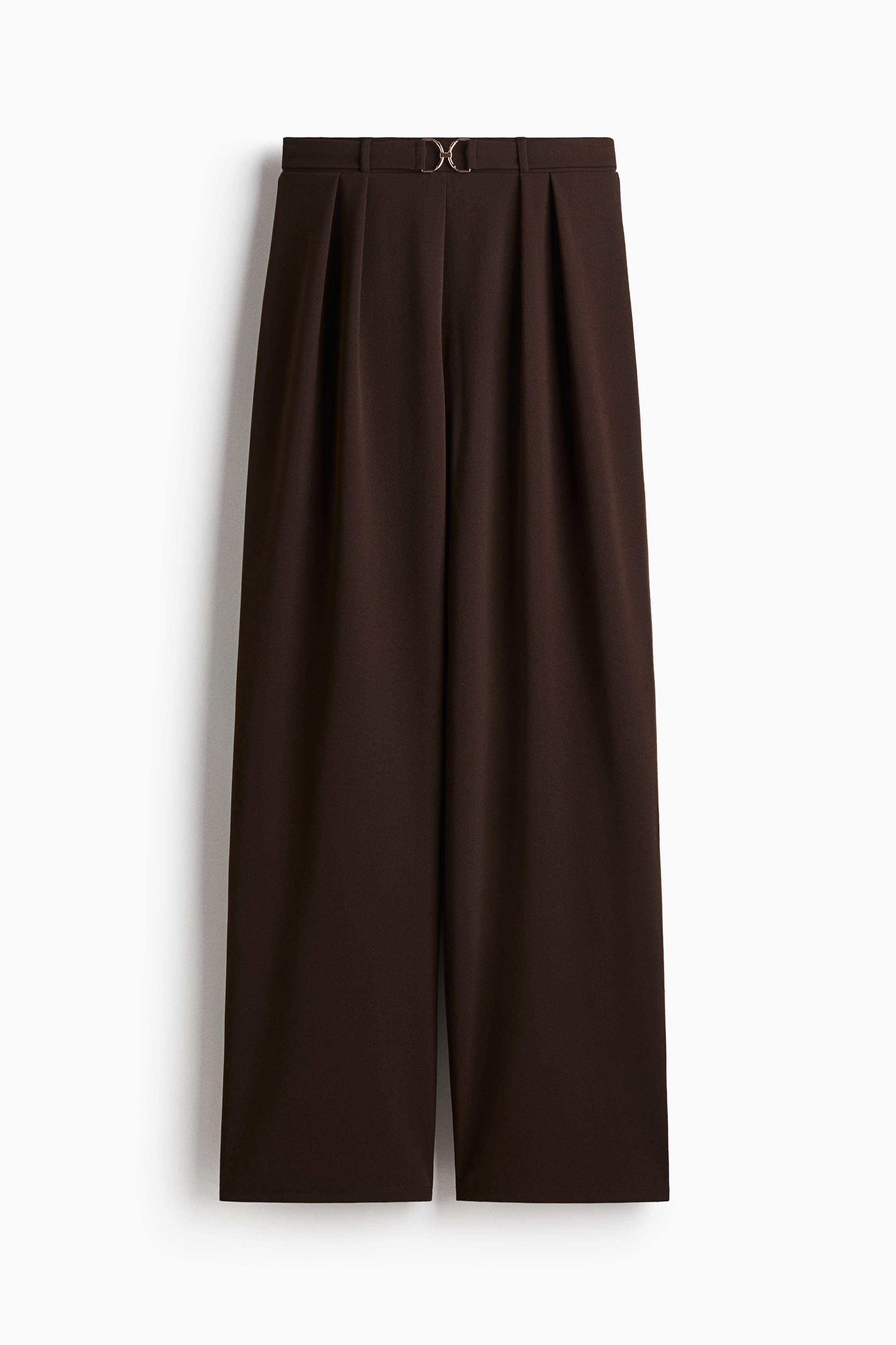 Элегантные брюки из креповой ткани с резинкой на высокой талии, складками спереди и декоративным ремнем с металлической пряжкой. Прямой крой и широкие штанины.