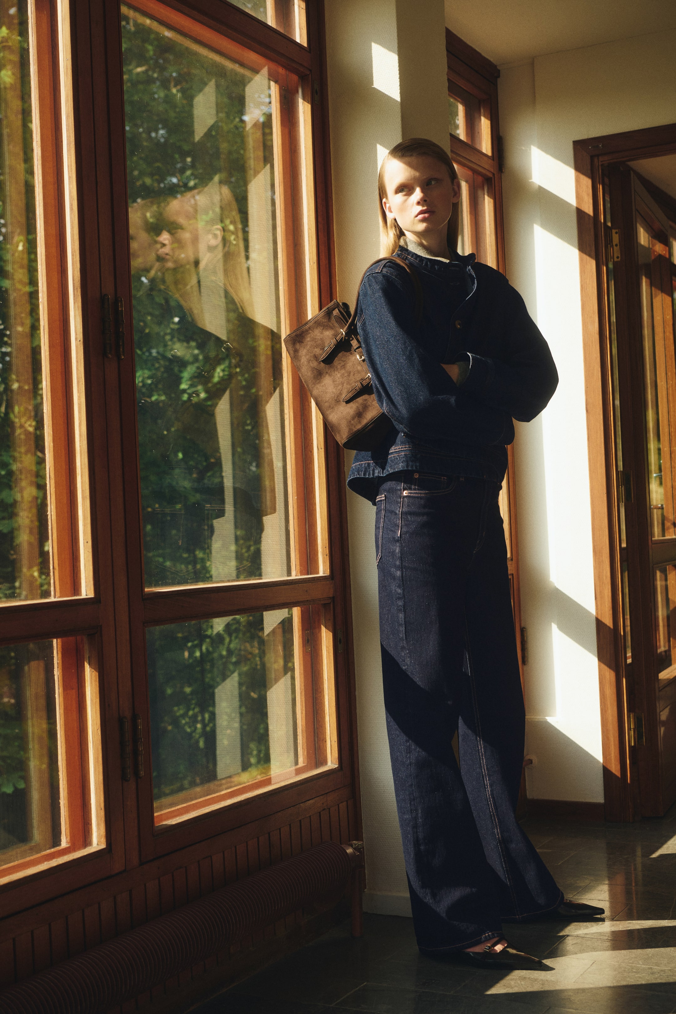 Бренд - H&M; Высота талии - Завышенная; Длина - Длинный; Модель - Узкий; Ткань - Типа деним; Узор - Однотонный; Цвет - Темно-синий; Штанина - Широкая