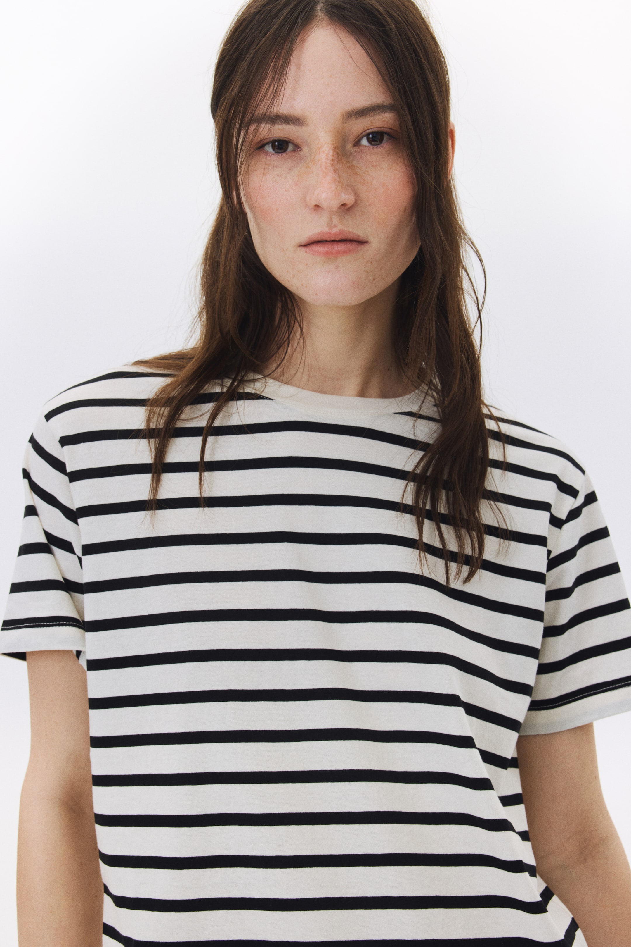 Бренд - H&M; Длина - Стандарт; Длина рукава - Короткий рукав; Материал (состав) - Хлопок; Модель - Стандарт; Тип воротника - Обычный; Узор - Полосатый; Цвет - Бежевый
