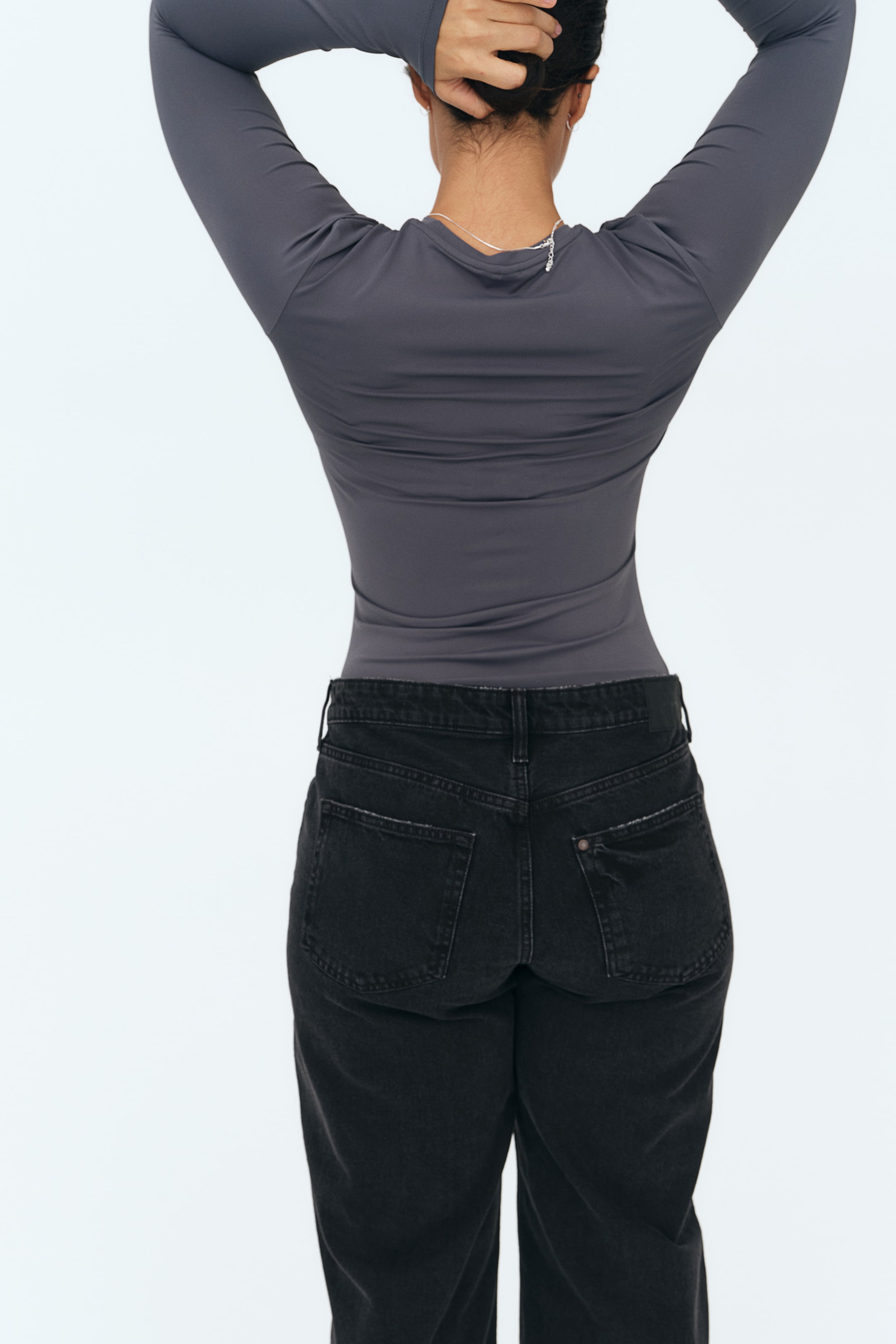 Мягкий верх из микрофибры с круглым вырезом, длинными рукавами и облегающим кроем. Воротник с тонкой отделкой.