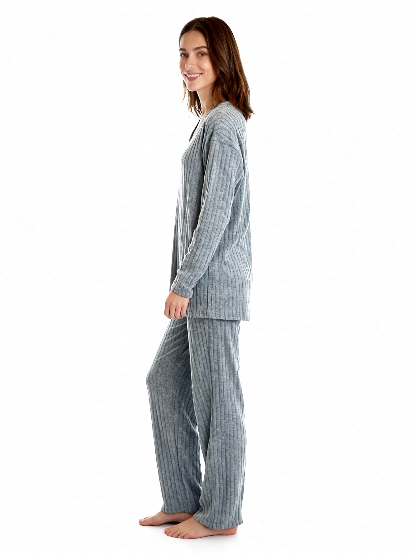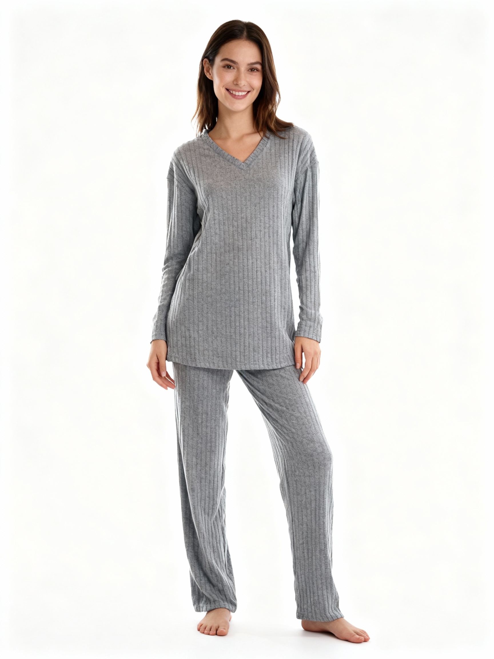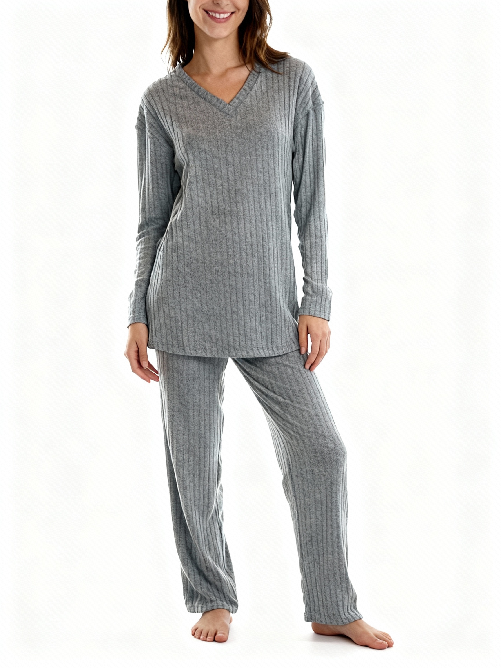 Высота талии - Нормальная; Длина - Стандарт; Длина рукава - Длинный рукав; Материал (состав) - Полиэстер; Модель - Свободный; Страна производства - Китай; Тип воротника - V-вырез; Толщина - Средний; Узор - Однотонный; Цвет - Серый; Штанина - Широкая