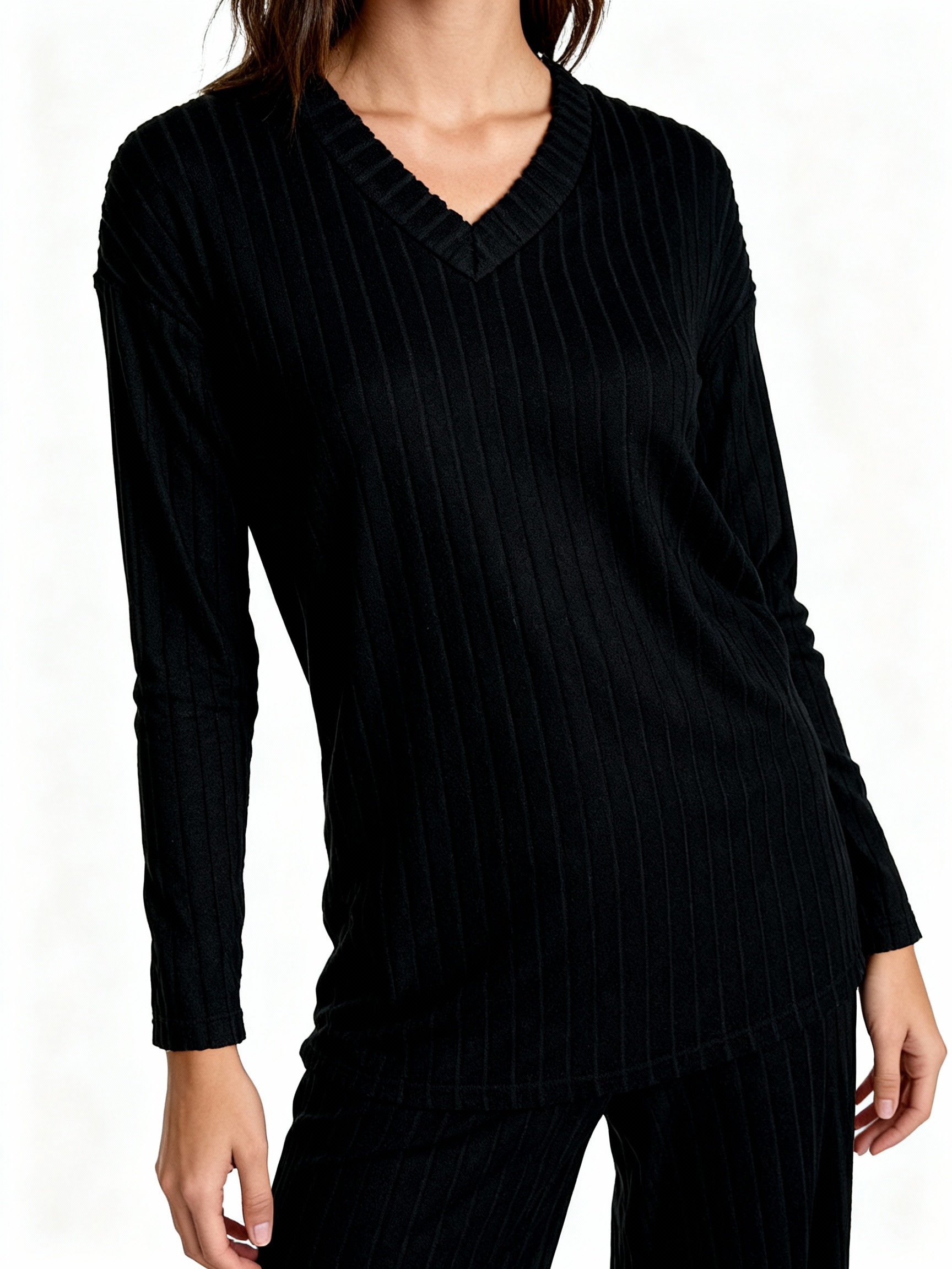 Высота талии - Нормальная; Длина - Стандарт; Длина рукава - Длинный рукав; Материал (состав) - Полиэстер; Модель - Свободный; Страна производства - Китай; Тип воротника - V-вырез; Толщина - Средний; Узор - Однотонный; Цвет - Черный; Штанина - Широкая