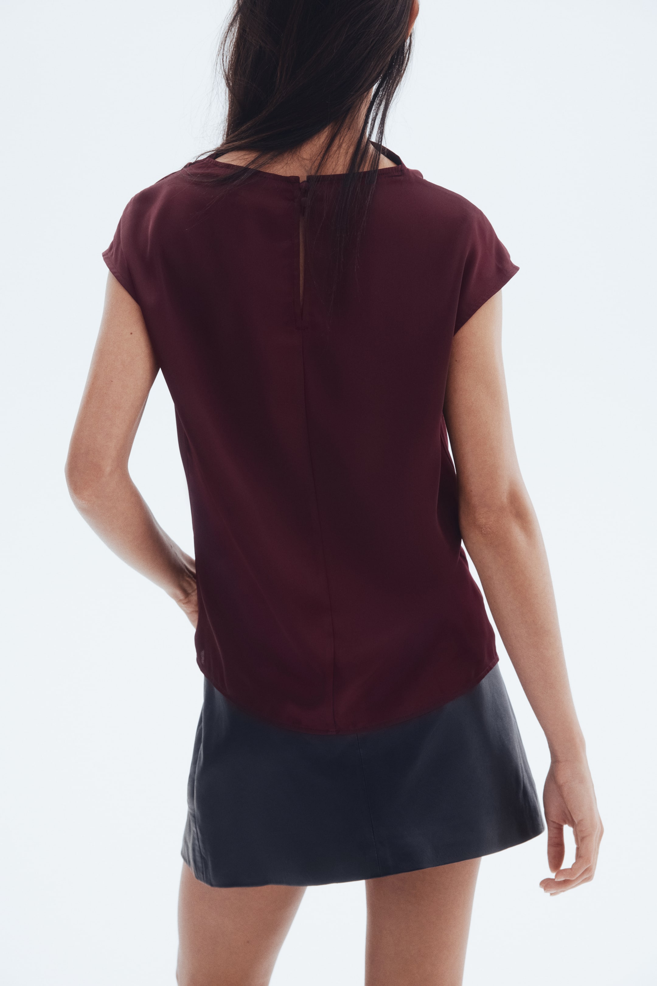 Бренд - H&M; Длина - Стандарт; Длина рукава - Короткий рукав; Материал (состав) - Полиэстер; Модель - Стандарт; Тип воротника - Отложной; Ткань - Атлас; Узор - Однотонный; Цвет - Бордовый