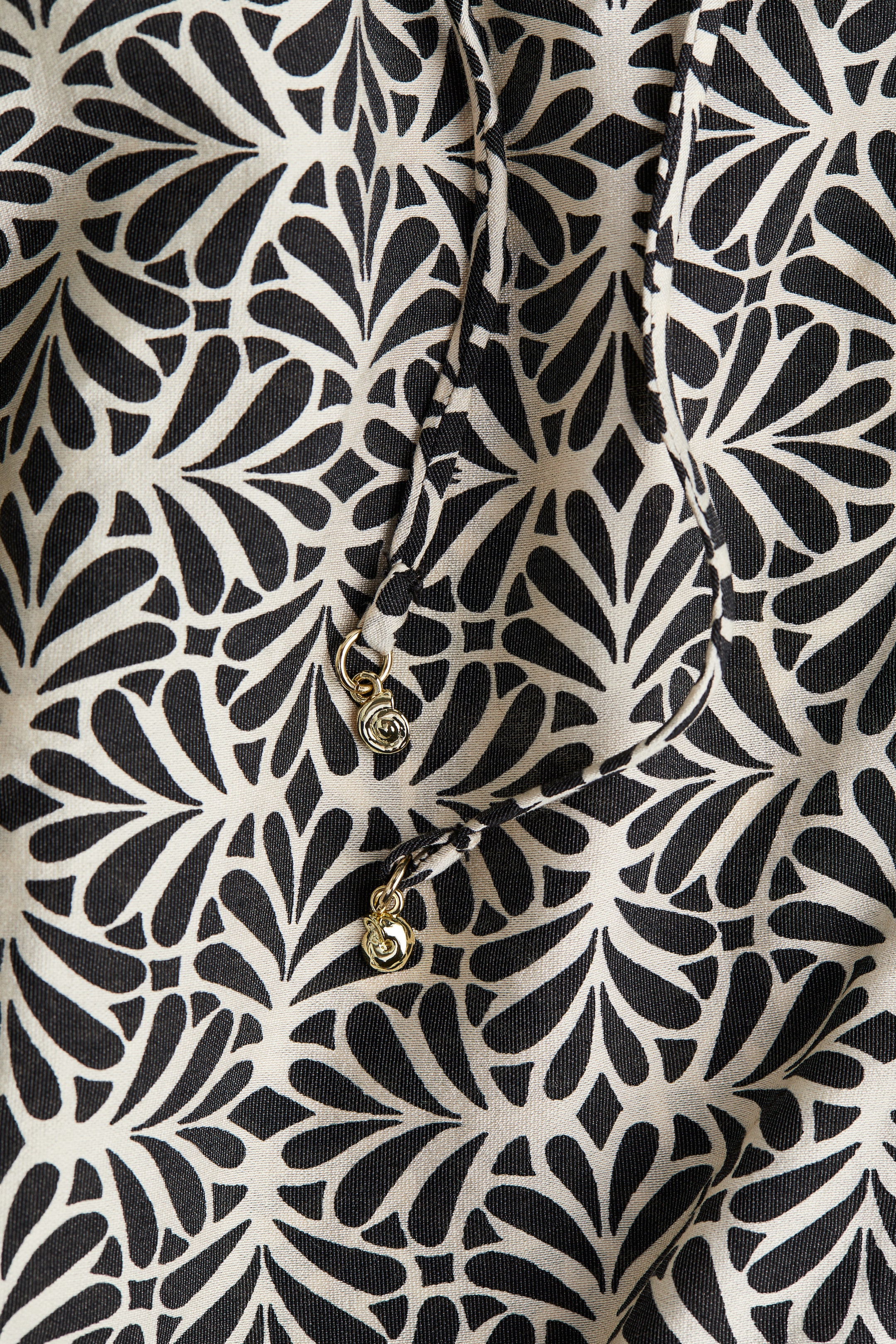 Тканая блузка свободного кроя с воротником-рюшем, V-образным вырезом и завязками-спагетти. Длинные регланные рукава баллон с разрезом и пуговицами на манжетах.