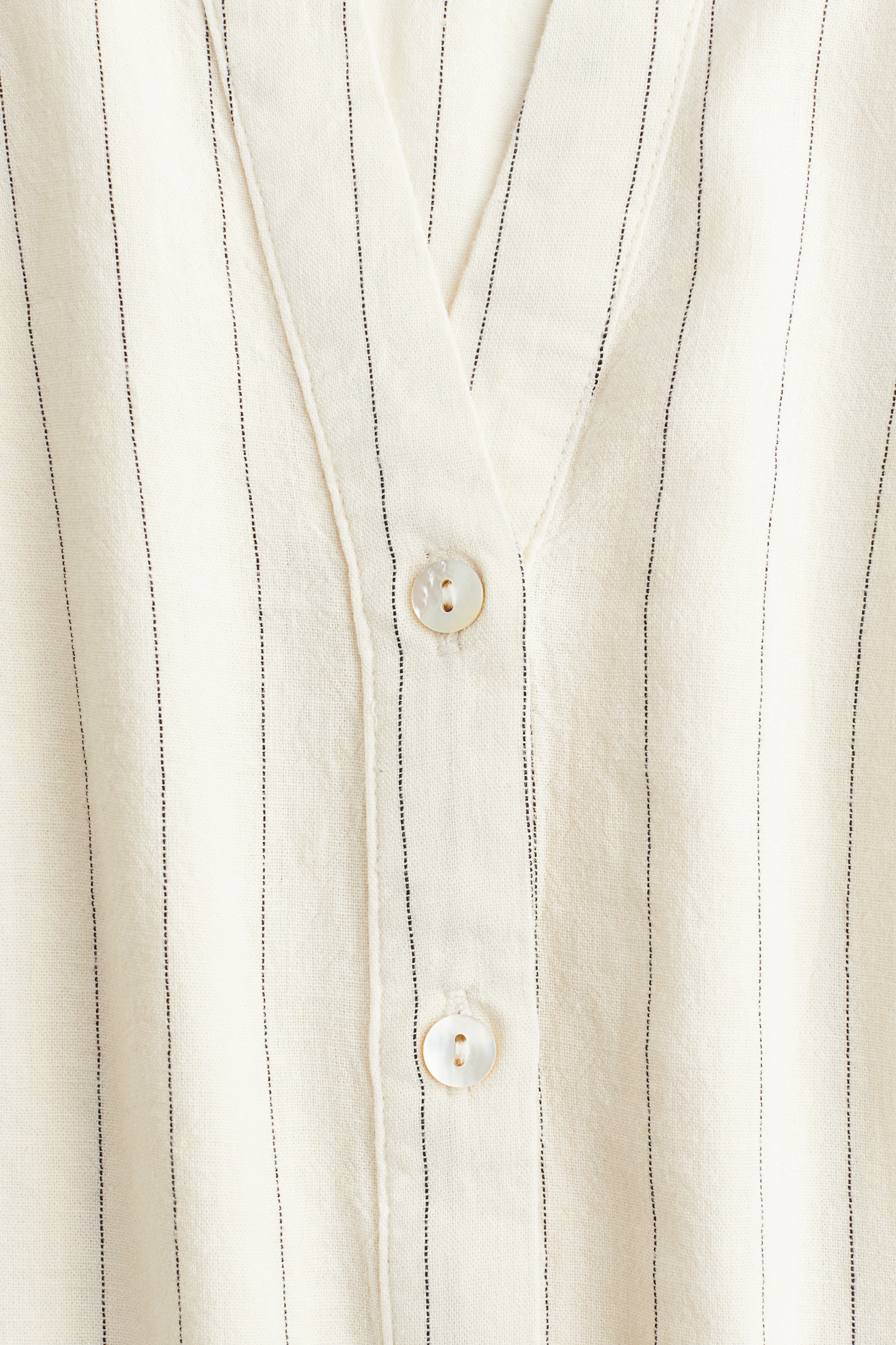 Короткая облегающая безрукавная блузка из тонкой ткани смесового состава лен-вискоза. Модель с V-образным вырезом, без рукавов, на пуговицах спереди. Для красивого силуэта имеет формообразующие вытачки спереди и сзади.