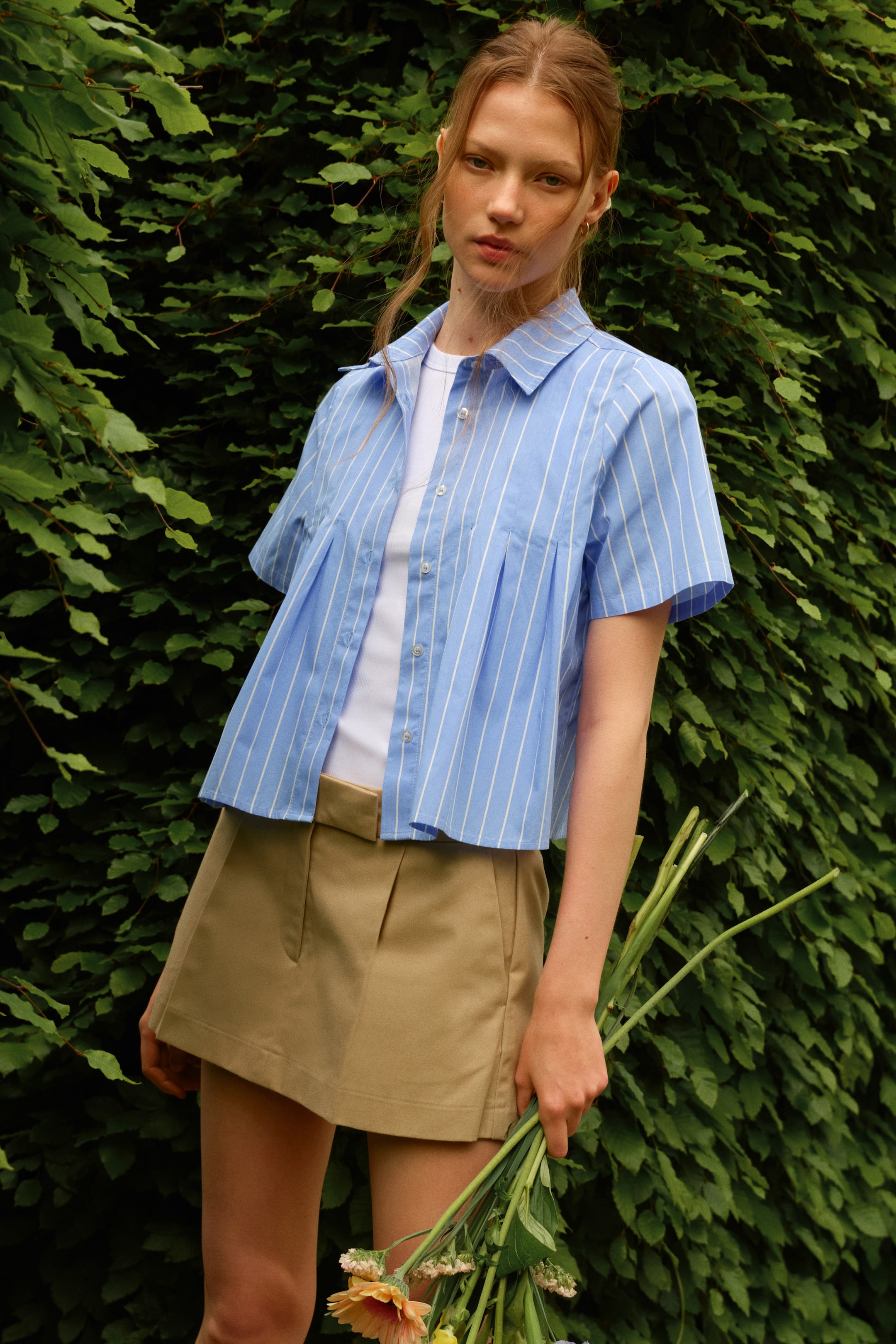 Хлопковая рубашка из тонкого поплина с воротником, короткими рукавами и застежкой на пуговицы спереди. Имеет встречные складки под грудью для дополнительного объема и одинарную складку под кокеткой на спине.
