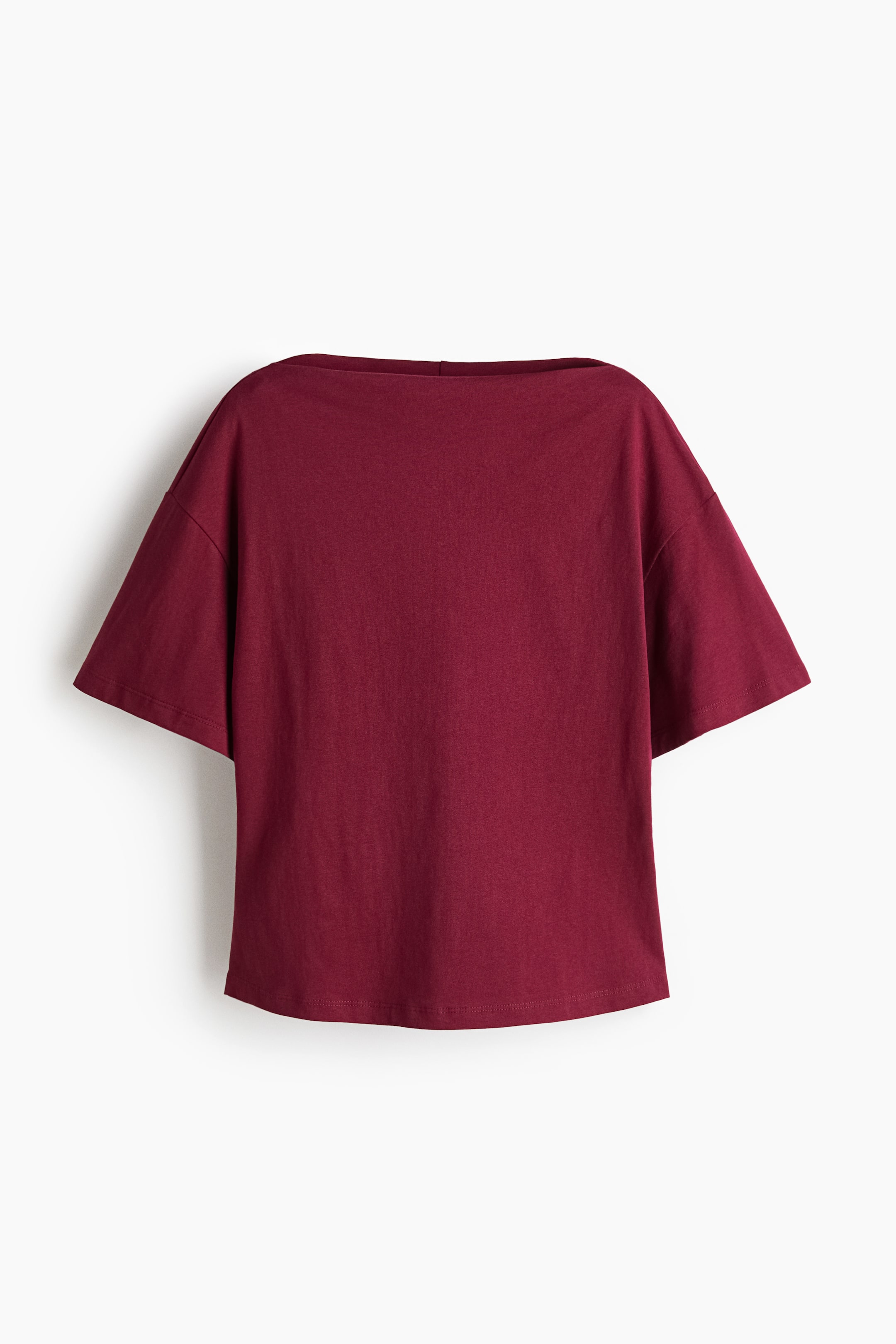 Бренд - H&M; Длина - Стандарт; Длина рукава - Короткий рукав; Материал (состав) - Хлопок; Модель - Стандарт; Тип воротника - Лодочка; Ткань - Джерси; Узор - Однотонный; Цвет - Бордовый